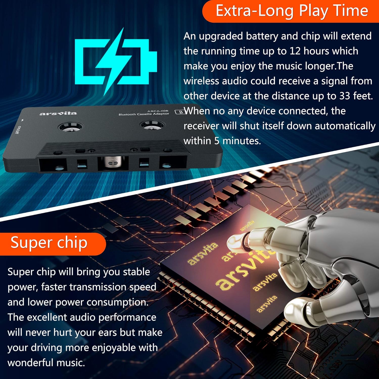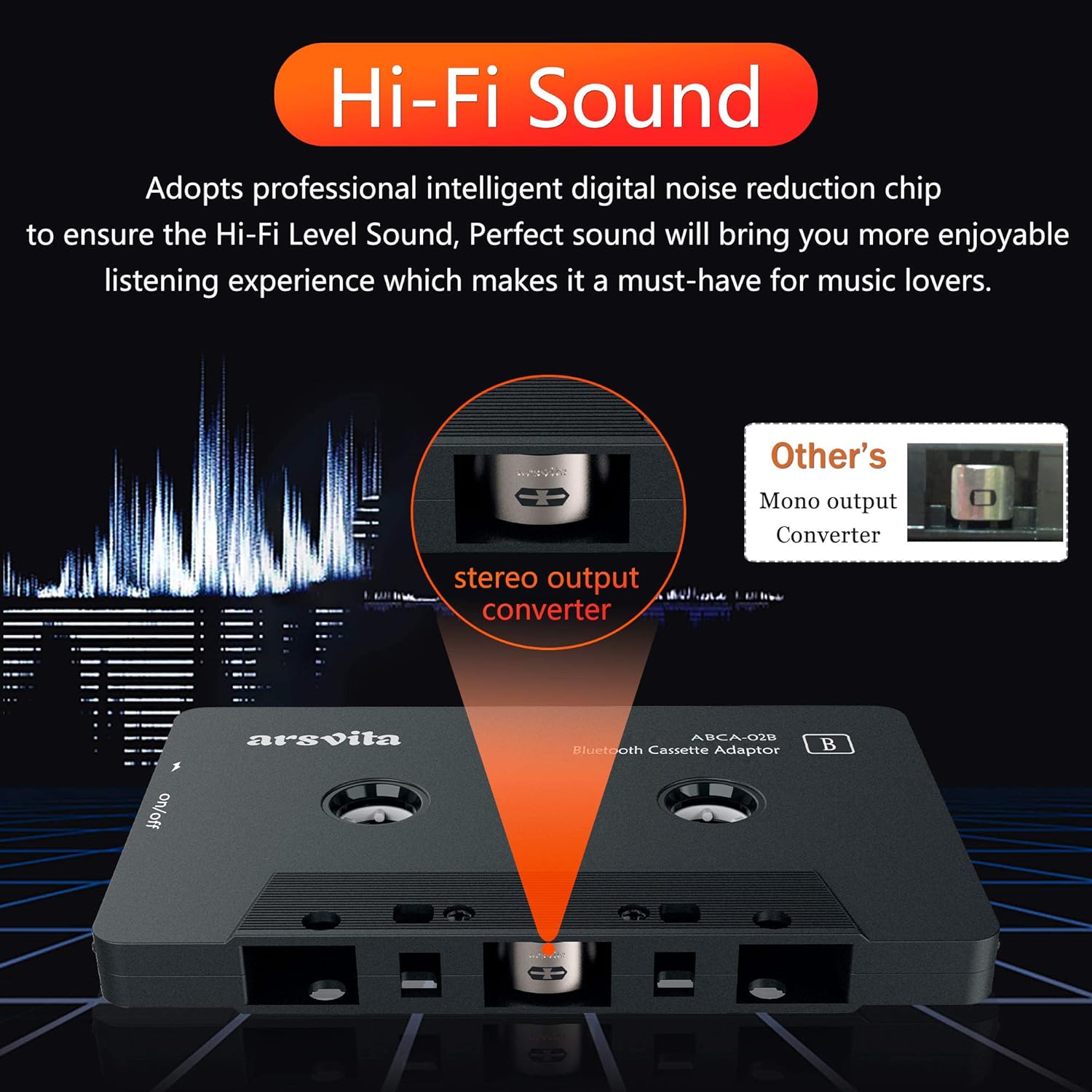 - 【Premium Sound Quality for Music】 The Arsvita Cassette Bluetooth receiver is compatible with most smartphones and is ideal for home or car audio systems. This is a box-type Bluetooth receiver for cars or devices that don't have Bluetooth and want to receive Bluetooth signals.Just adjust the audio equalization settings on the player and you'll get the music classics!
