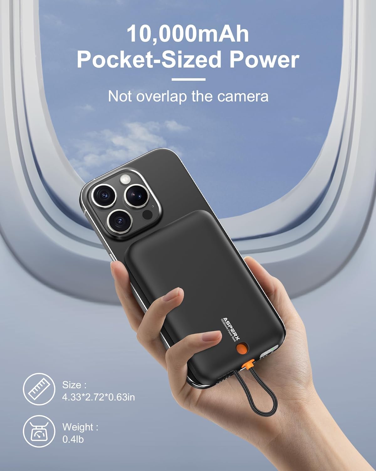 - [Power Bank with MagSafe] The AsperX Magnetic Wireless Power Bank effortlessly attaches to the back of your phone with a secure magnetic connection, eliminating concerns about tangled cables or slippage during charging. Designed for iPhone 12-16 series and other smartphones supporting magnetic wireless charging, it ensures reliable performance. (Note: For optimal grip, we recommend using a magnetic-compatible case or charging without a case to maintain strong adhesion)
