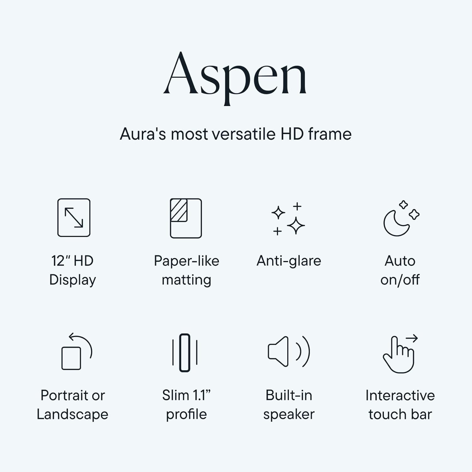 Share unlimited photos and videos from your phone to Aspen, Aura's perfectly-sized 12” HD frame that gives your favorite memories the spotlight they deserve. Thoughtfully designed with an anti-glare, dual-orientation display and a remarkably slim profile, Aspen combines style and innovation for a photo-sharing experience like never before.