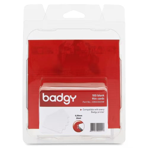 Blank thin cards are part of Badgy100 and Badgy200 printing systems that generate personalized cards in less than a minute. Cards are made of PVC for durable use. With a thickness of 0.76mm (30 mil), (CR-80) credit card-size, white cards may be printed on both sides.