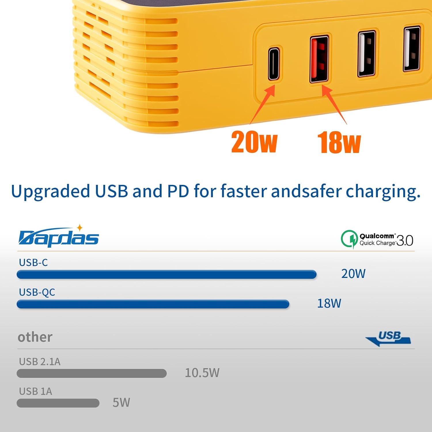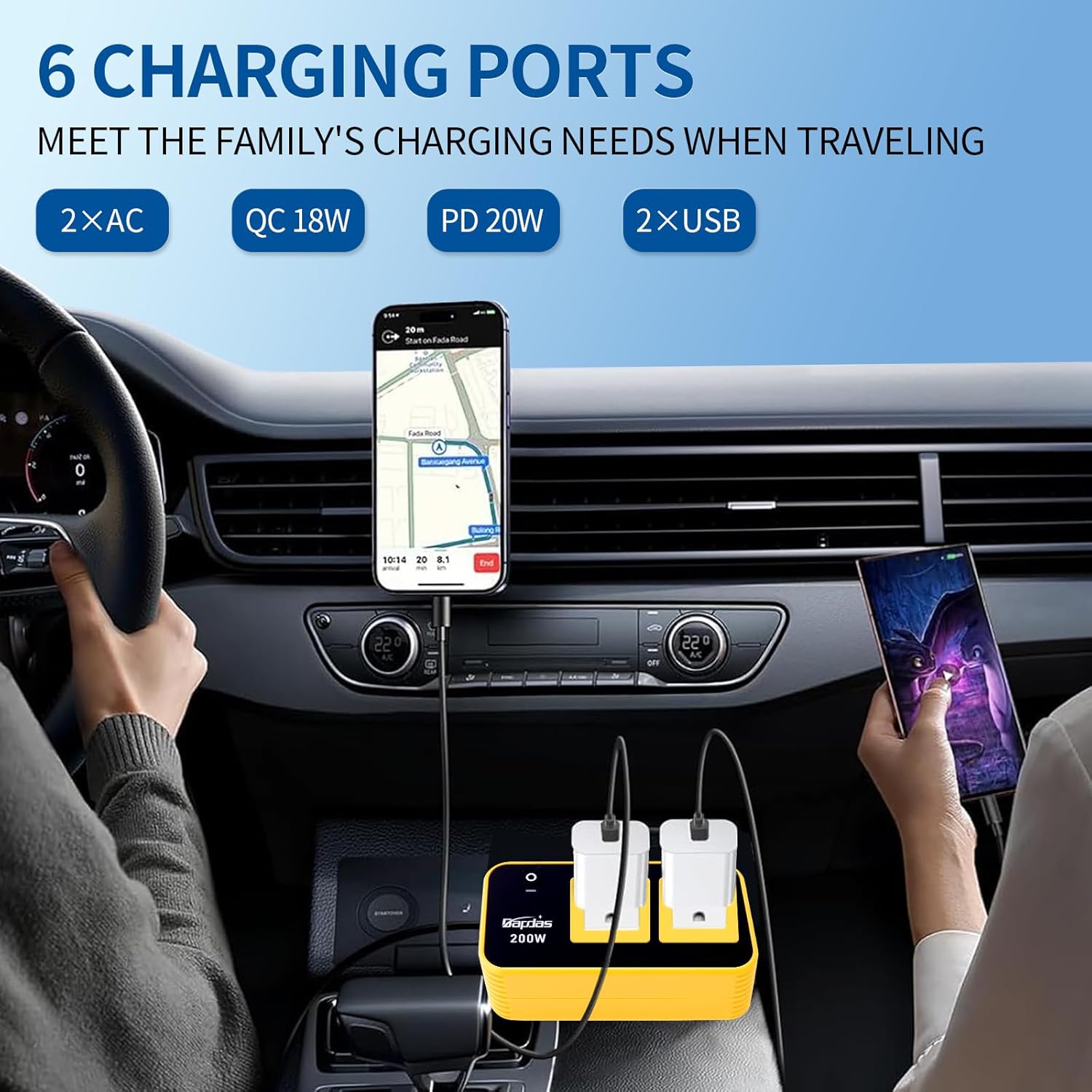- Portable and Fast: The car charɡer adapter is only the size of a mobile phone (5x2.7x1.4 inches, 8.5 oz+), equipped with USB-QC (18W), USB-C (20W), 110V AC Outlet, which can quickly charge electronics, making travel, camping and work more convenient.