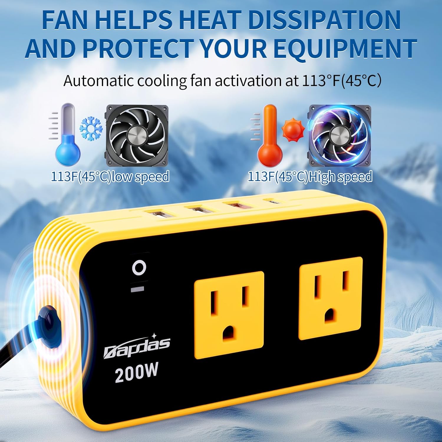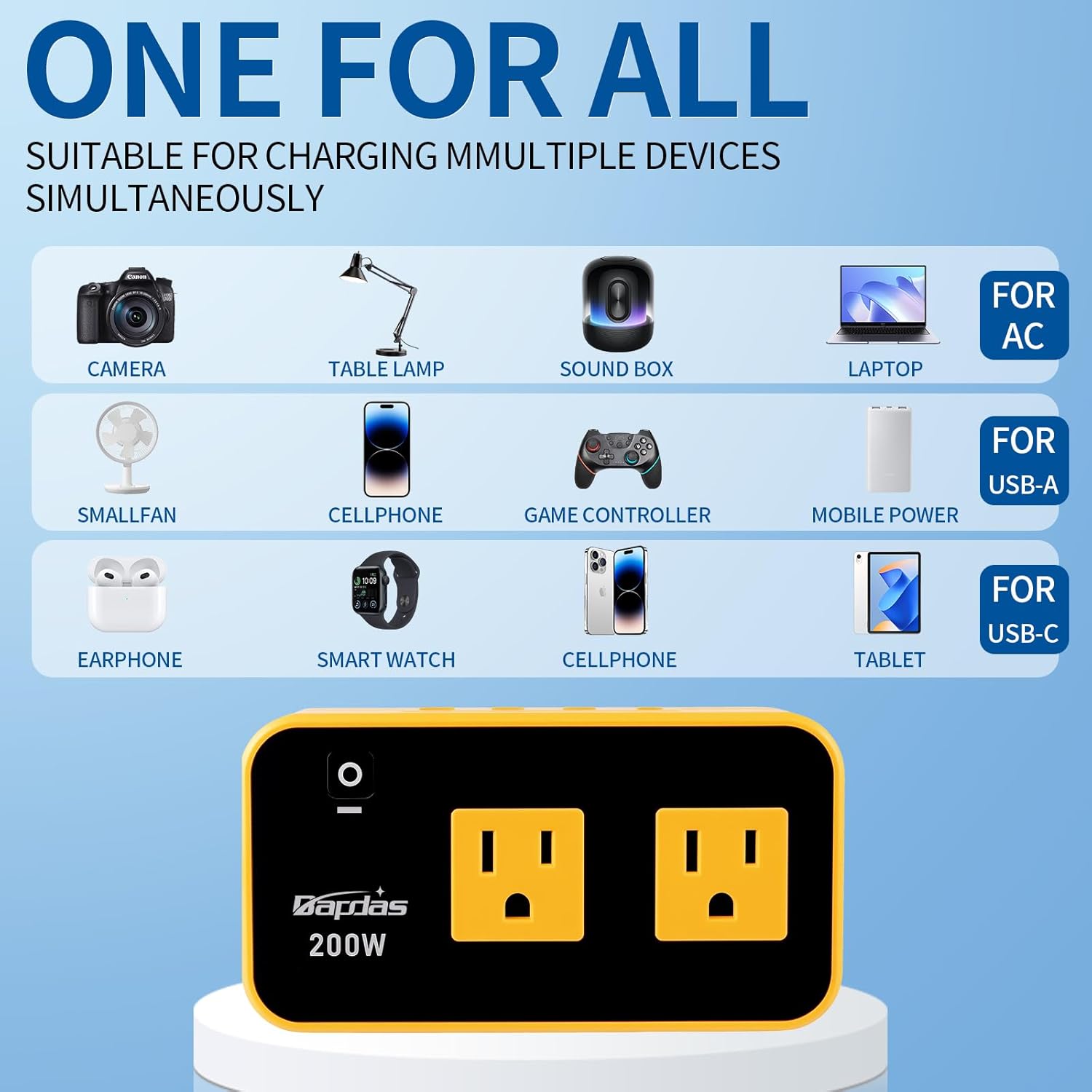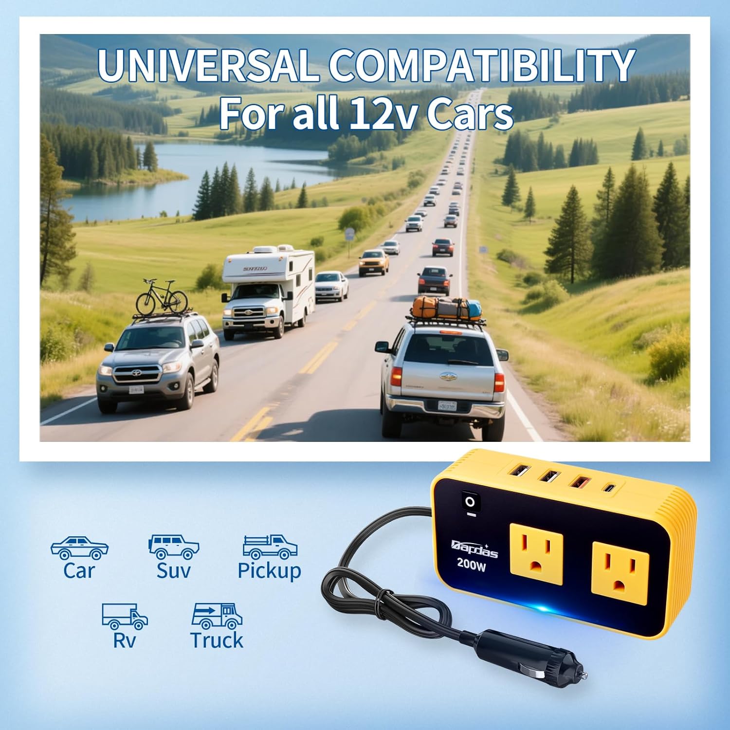 Bapdas 200W Car Power Inverter, DC 12V to 110V Car Charɡer Adapter with 20W USB-C/QC(18W)/4.8A Dual USB/Dual AC Outlet, Car Outlet Adapter Plug for Laptop