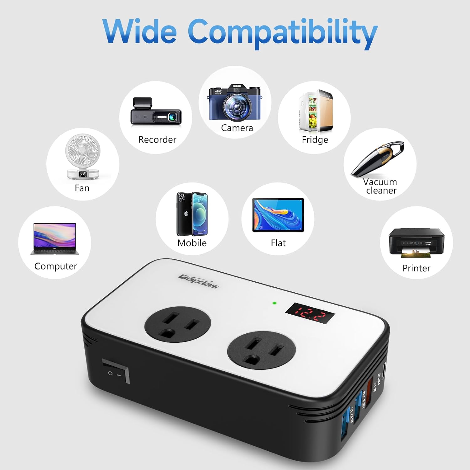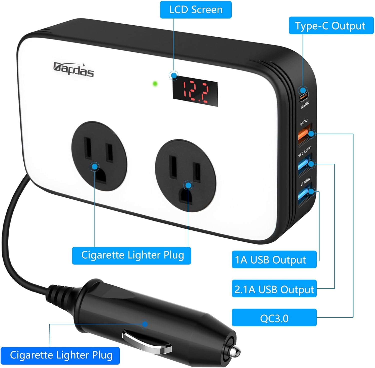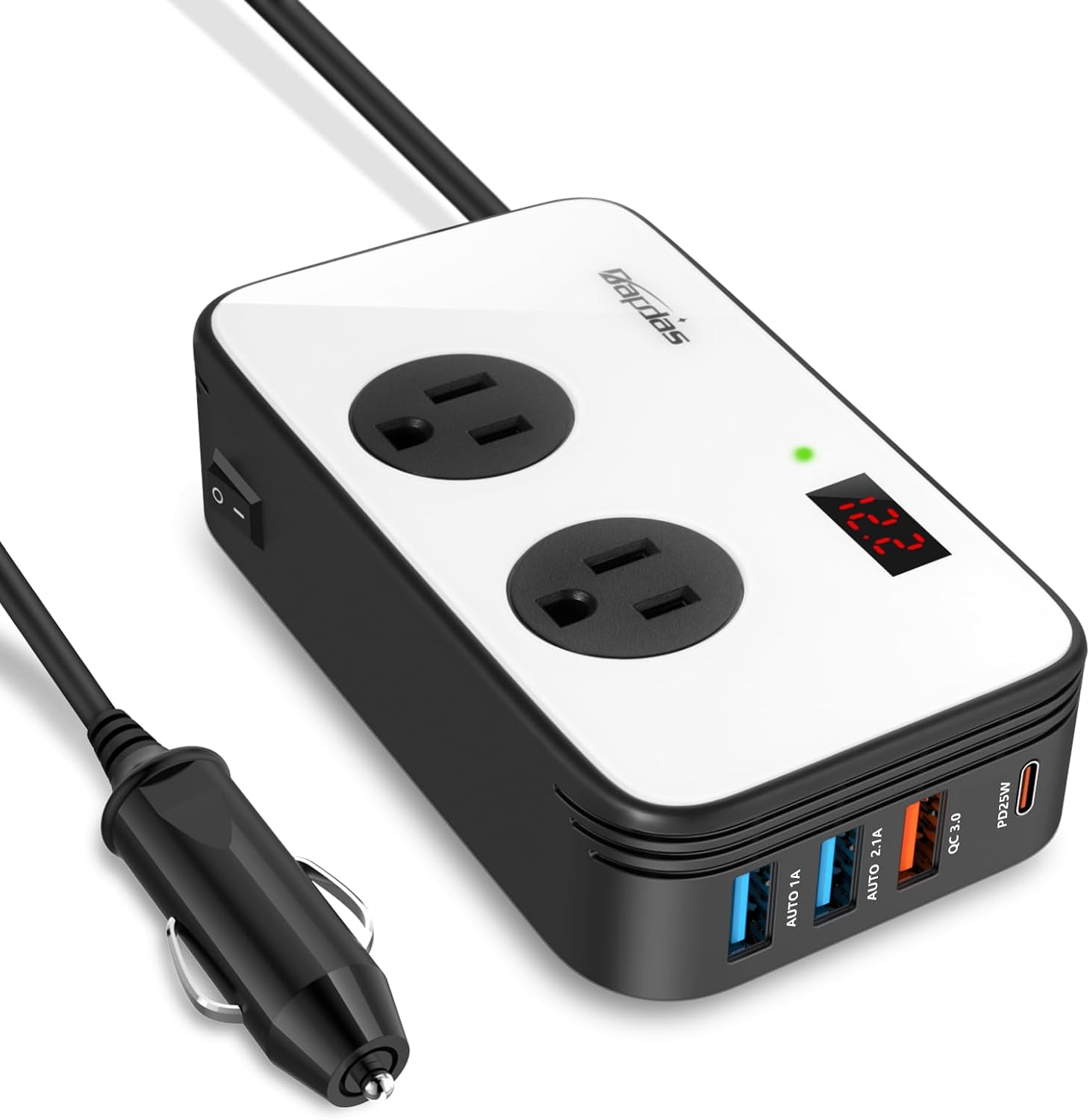 Bapdas 200W Power Inverter DC 12V to AC 110V Car Adapter Plug Outlet with PD 25W USB-C, QC3.0 and Dual USB Ports Loptop Car Charger