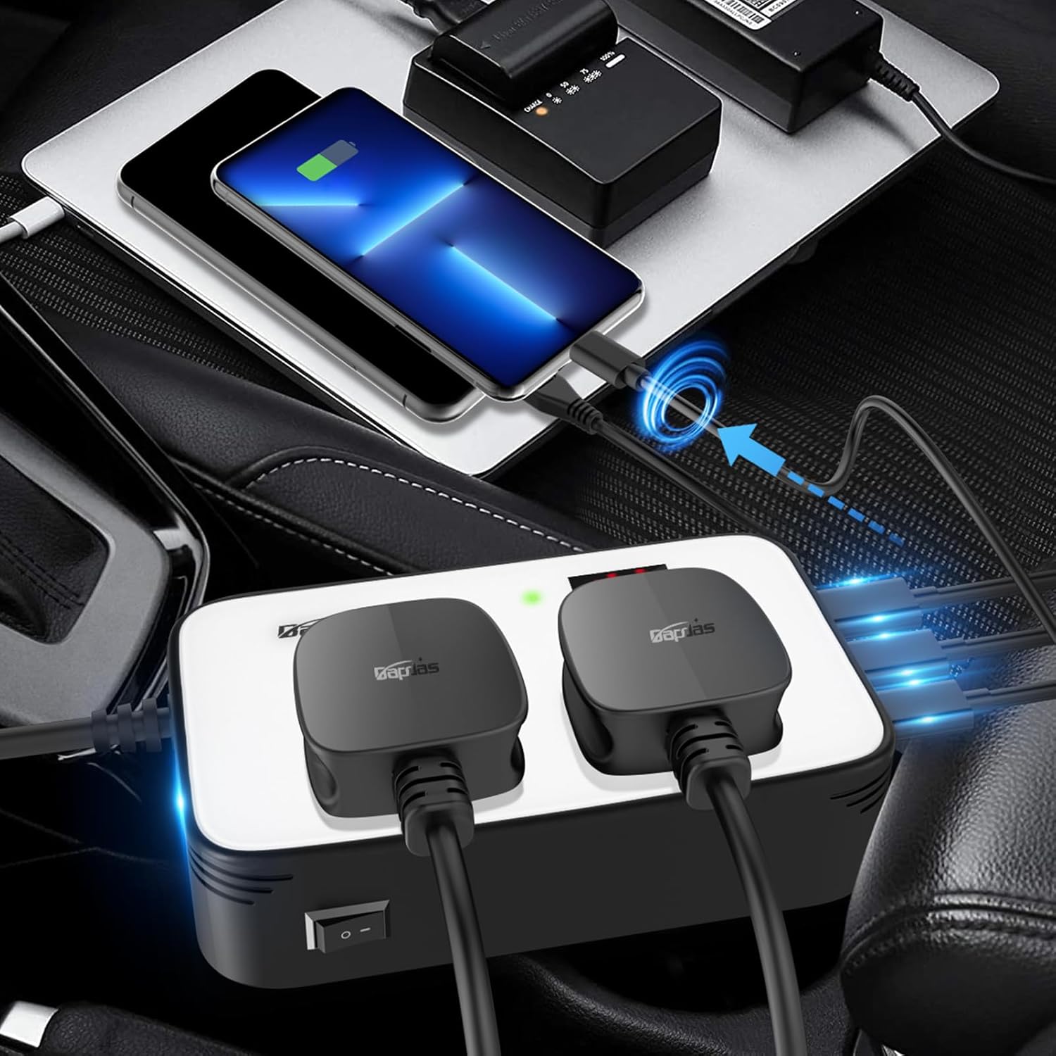 charging various devices in vehicles, using during camping, road trips, or remote job sites, powering such as laptops, cameras, small appliances, and CPAP machines