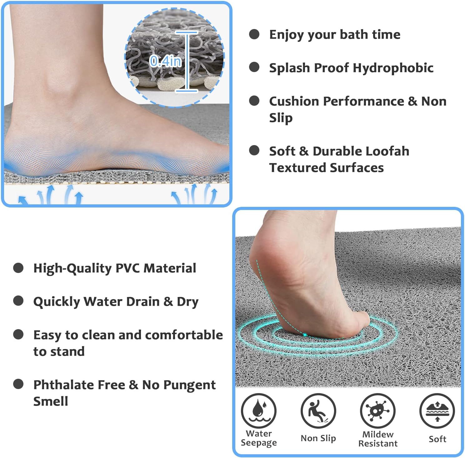 • Soft textured mat for bathroom with cut-out design, drain holes to allow the water to flow out and made the non-slippery mats dry quickly. prevent the mat to get stink, and enhance friction. You also can hang it up to keep dry.