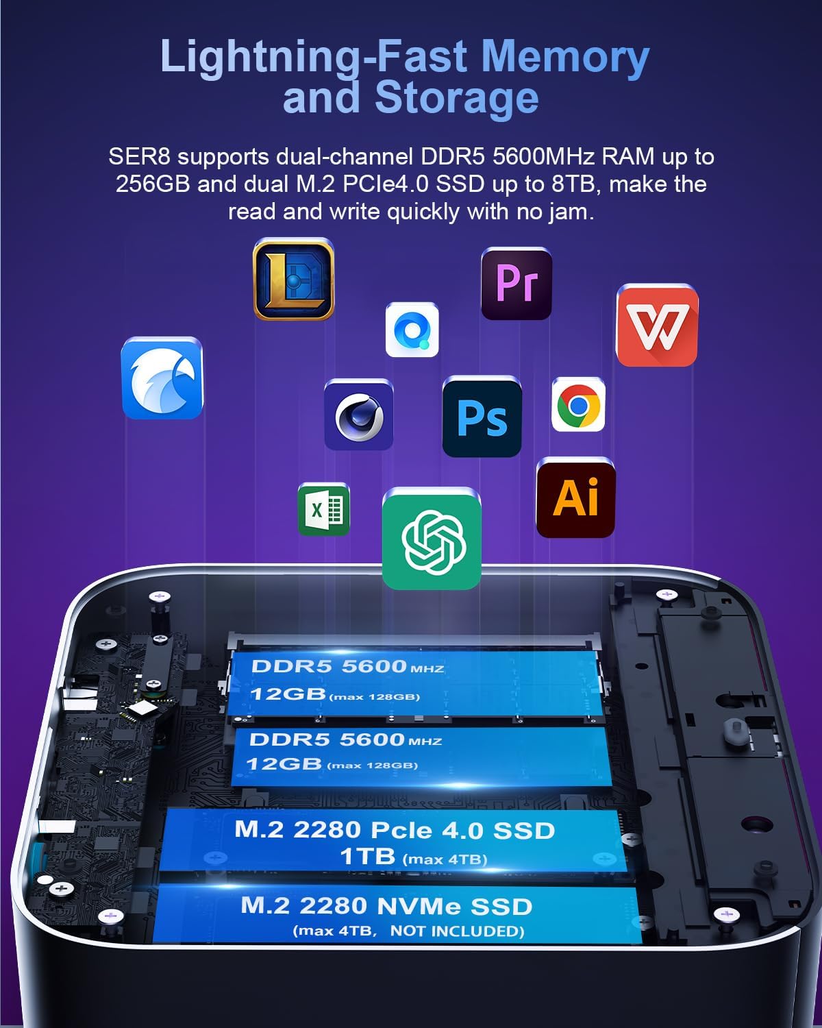 - 【Large Capacity & Expand Friendly】Beelink 8745HS mini pc comes with 24GB dual channel DDR5-5600MHz RAM (16GB*2, max 256GB) and 1TB M.2 PCIe 4.0 SSD (dual SSD slots, max 4TB*2) . Large capacity helps to save more large programs in the mini desktop pc and brings smoother operation of multi-tasking. High-speed SSD enables quicker load time of large files, high resolution content and large-scale games