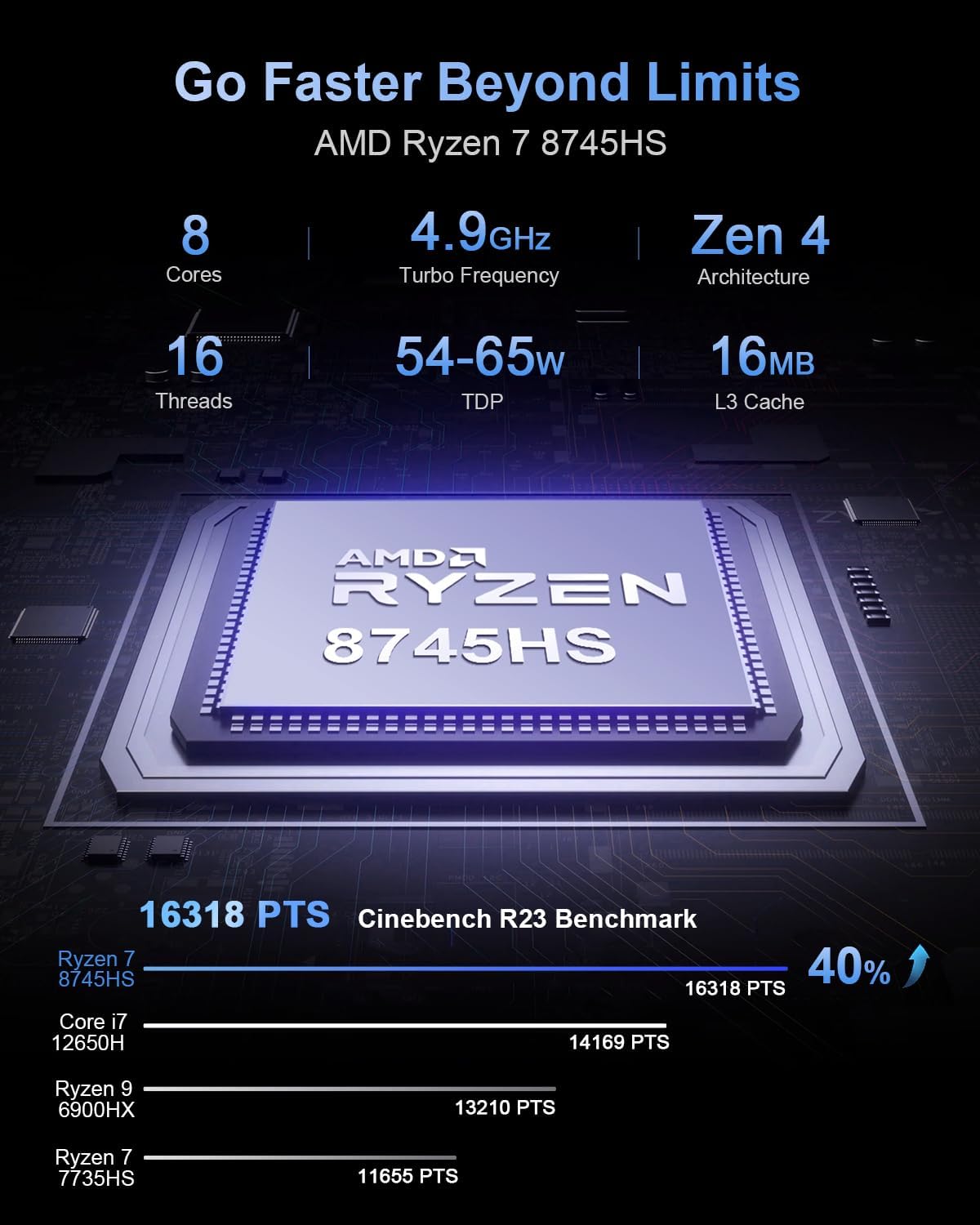 - 【Beelink Next Gen Powerhouse】The Latest Beelink SER8 mini pc is powered by AMD Ryzen 7 8745HS processor (3.8GHz-4.9GHz, 8 cores 16 threads, 16M L3 Cache, Zen 4 architecture, 28% performance boost over the Ryzen 7 7735HS). Perfect for streaming high-definition videos, editing high-resolution images, engaging in professional-level design work and playing popular games like LoL, CS:GO, DOTA2, PUBG.