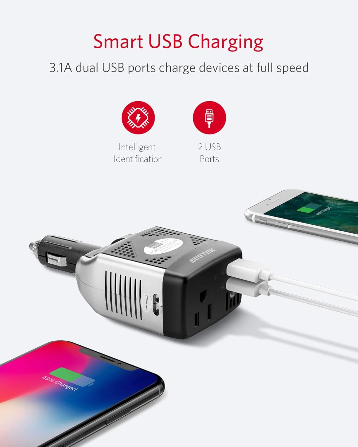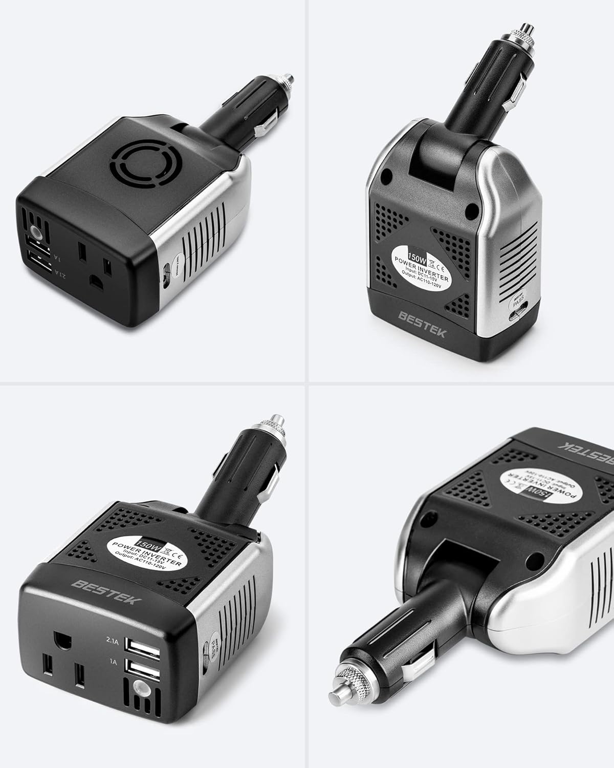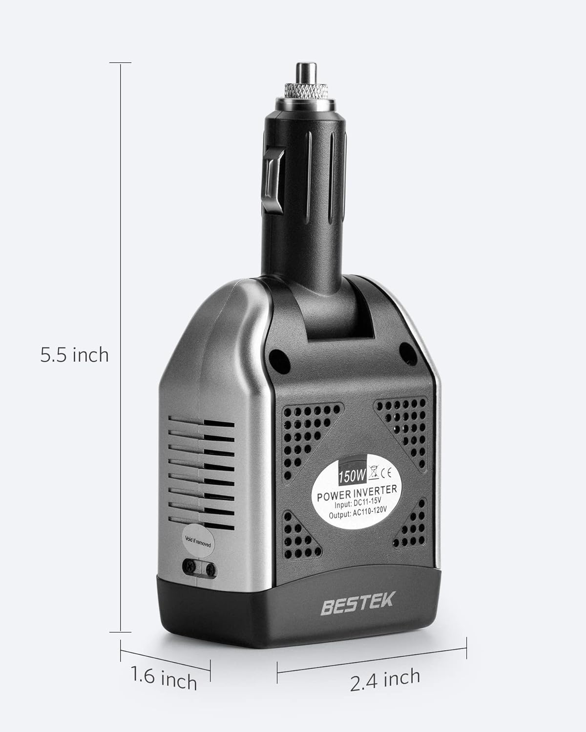 - BESTEK Advantage: Amazon's #1 power inverter brand. Provides 150 watts continuous DC to AC power and 360 watts of peak power with 1 AC outlets and 2 USB charging ports.