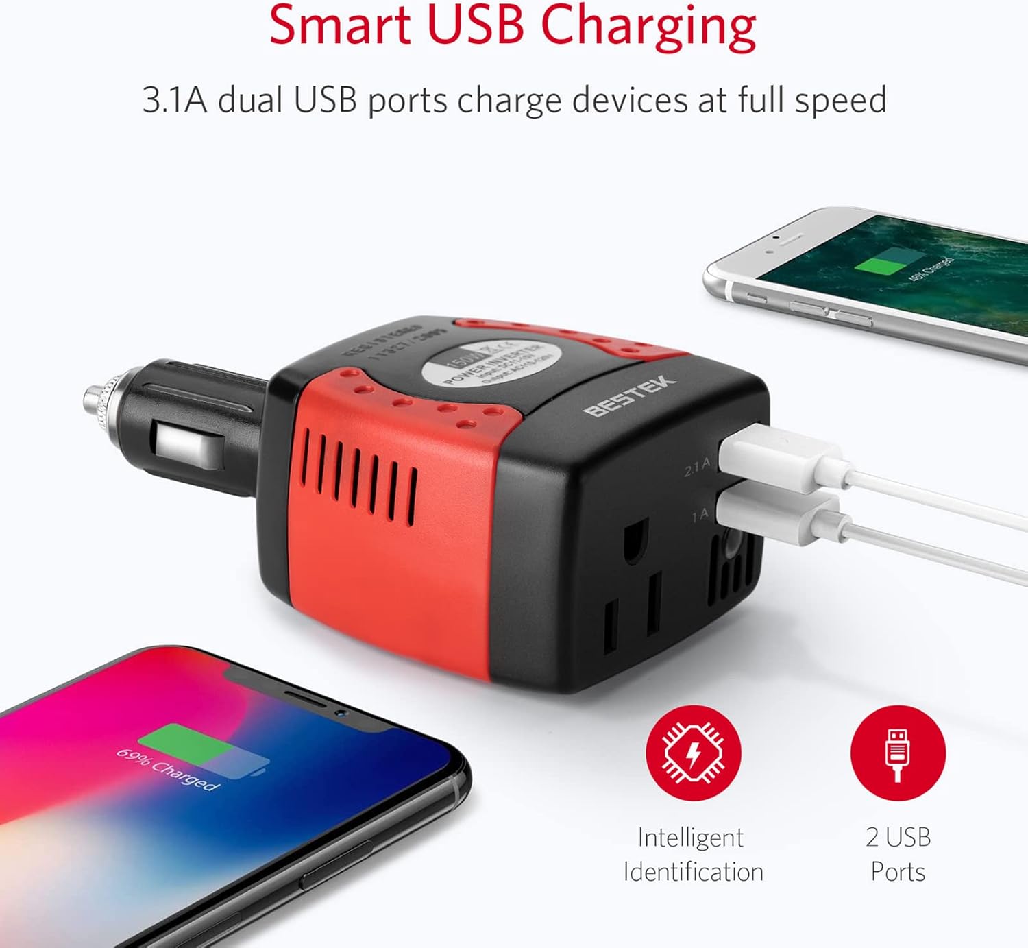 - DC to AC Inverter: transform the voltage from DC 12V to AC 110V, the AC outlet and 3.1A dual USB charging ports ideal for powering laptops, tablets, smartphones, power bank and other electronic devices