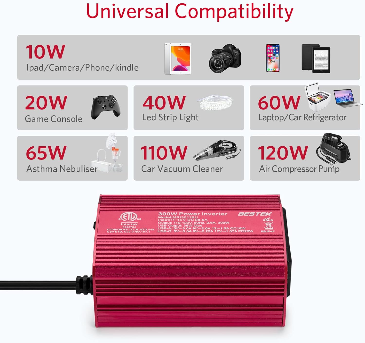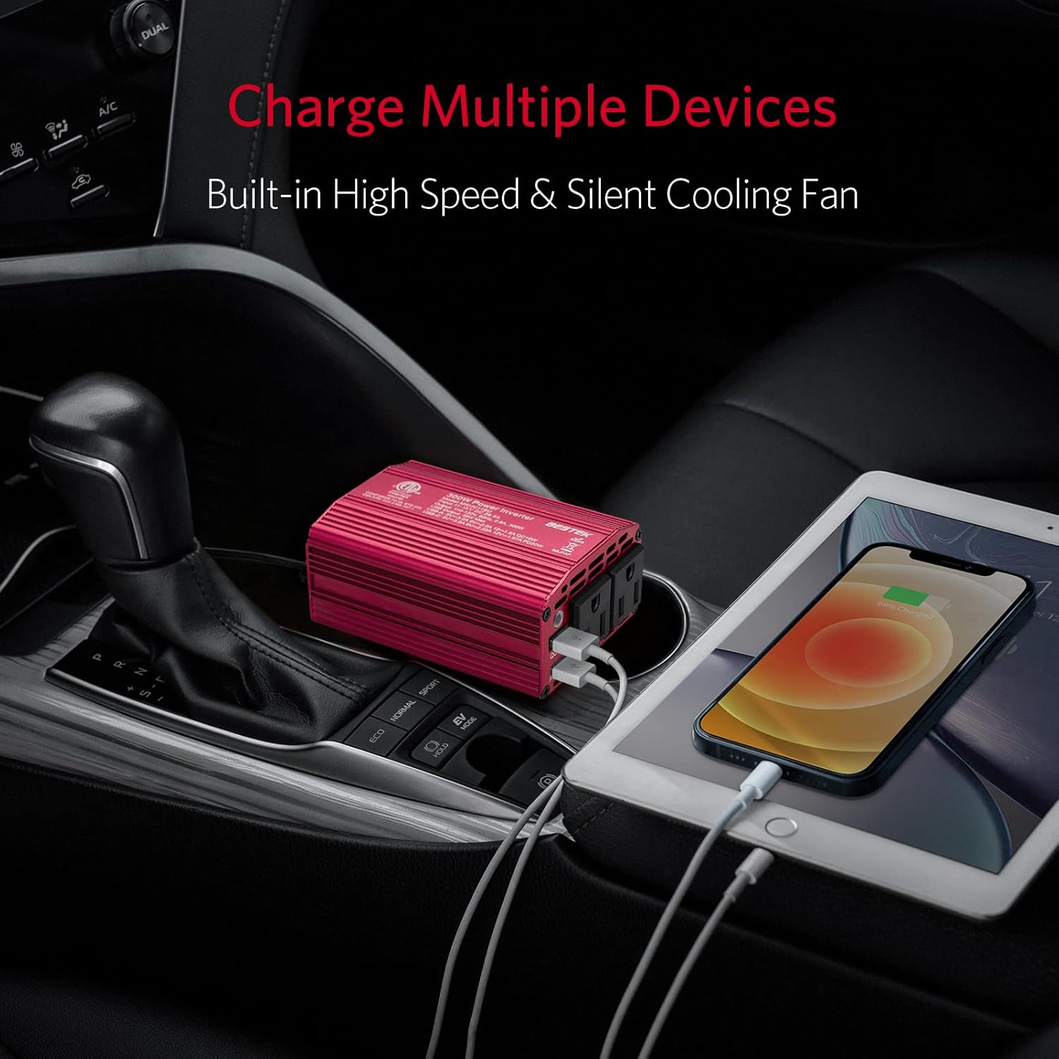 - Portable & Widely Useful: The lightweight inverter space-saving and easy storage, Ideal for use on long car road trips, family vacations, and camping. Great for charging string lights, laptop, tablet, breast pump, CPAP machine, GoPro camera, nebulizer, game console, kindle, TV, DVD players, lights, iPhones, iPad, car vacuum cleaner, LED table lamp, mini fridge and other electronic devices.