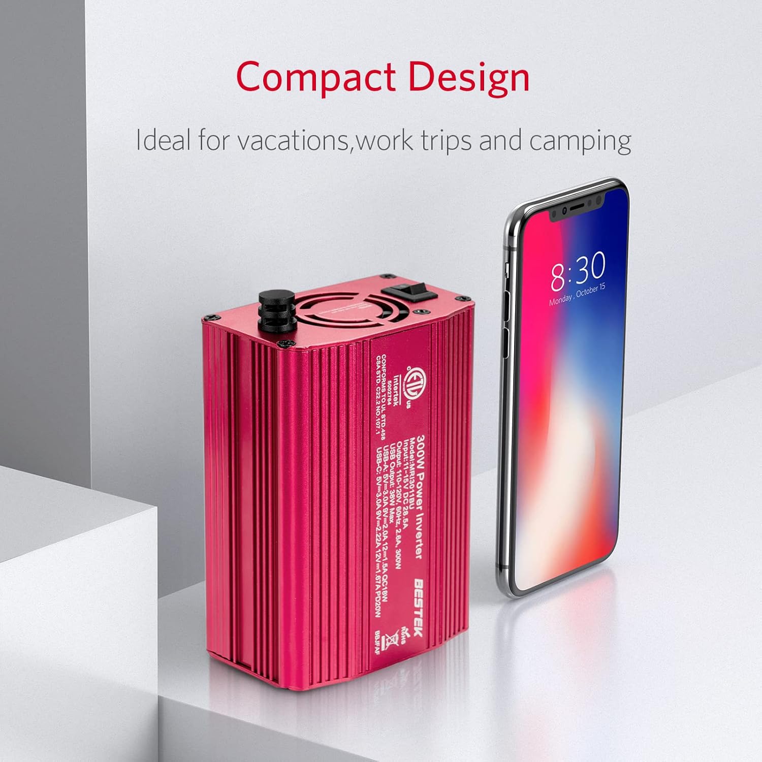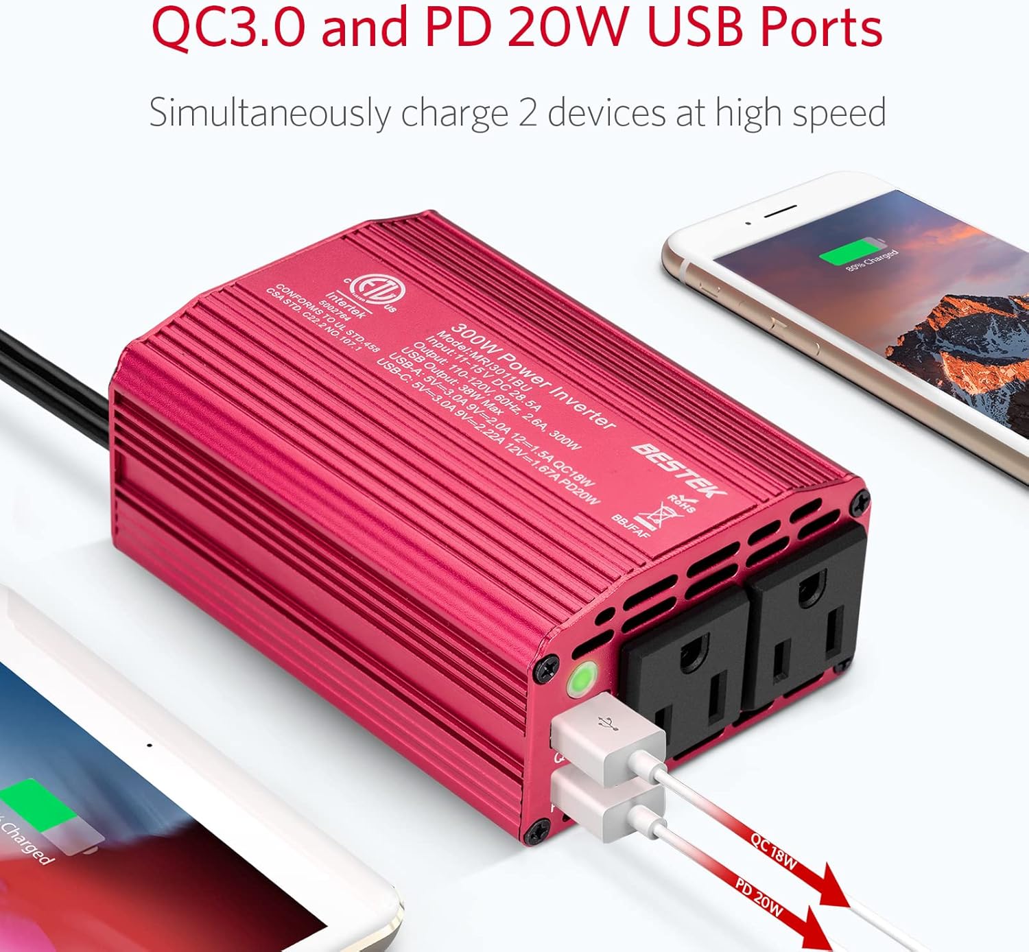 - Powerful 300W Car Power Inverter:Car power converter provides 300 Watts continuous, 700 Watts peak surge during load start-up,and DC 12v to AC 110v power inverter featuring PD 20W&QC 18W USB ports, 2 AC Outlets and a 24 inch cable with cigarette lighter plug.