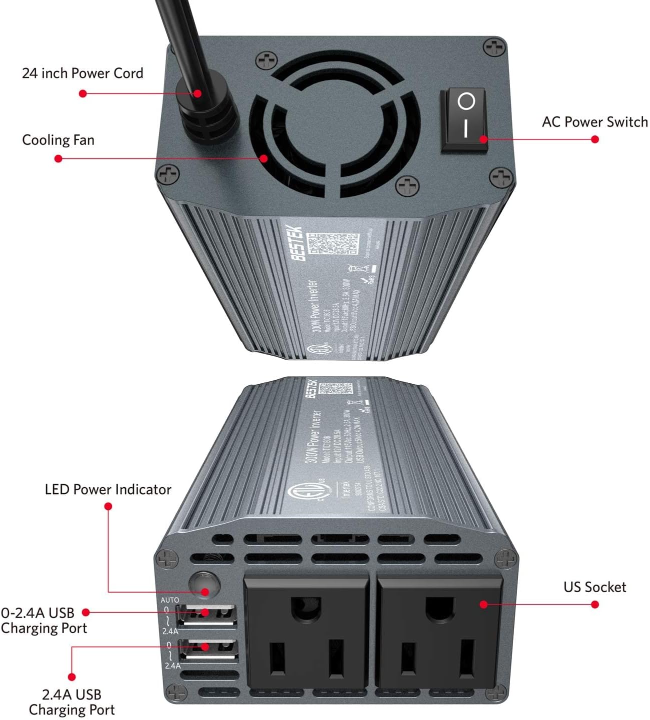 - BESTEK Advantage: Power inverter patents owner, America's leading power inverter brand. Provides 300 Watts continuous DC to AC power and 700 Watts instantaneous power, featuring 2 AC outlets and 2 USB ports