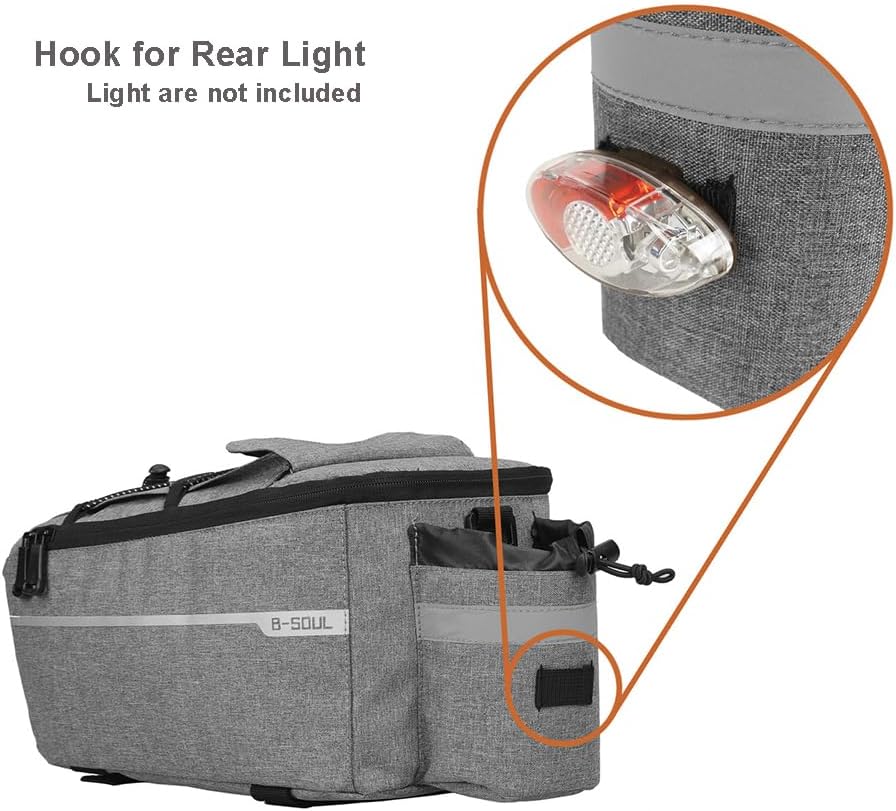 • Safety Design: This bicycle rear seat bag is designed with two side reflective logos, all-around reflective pipeline and back reflective strip with taillight loop (not included taillight), which provide bikers a safer night riding.