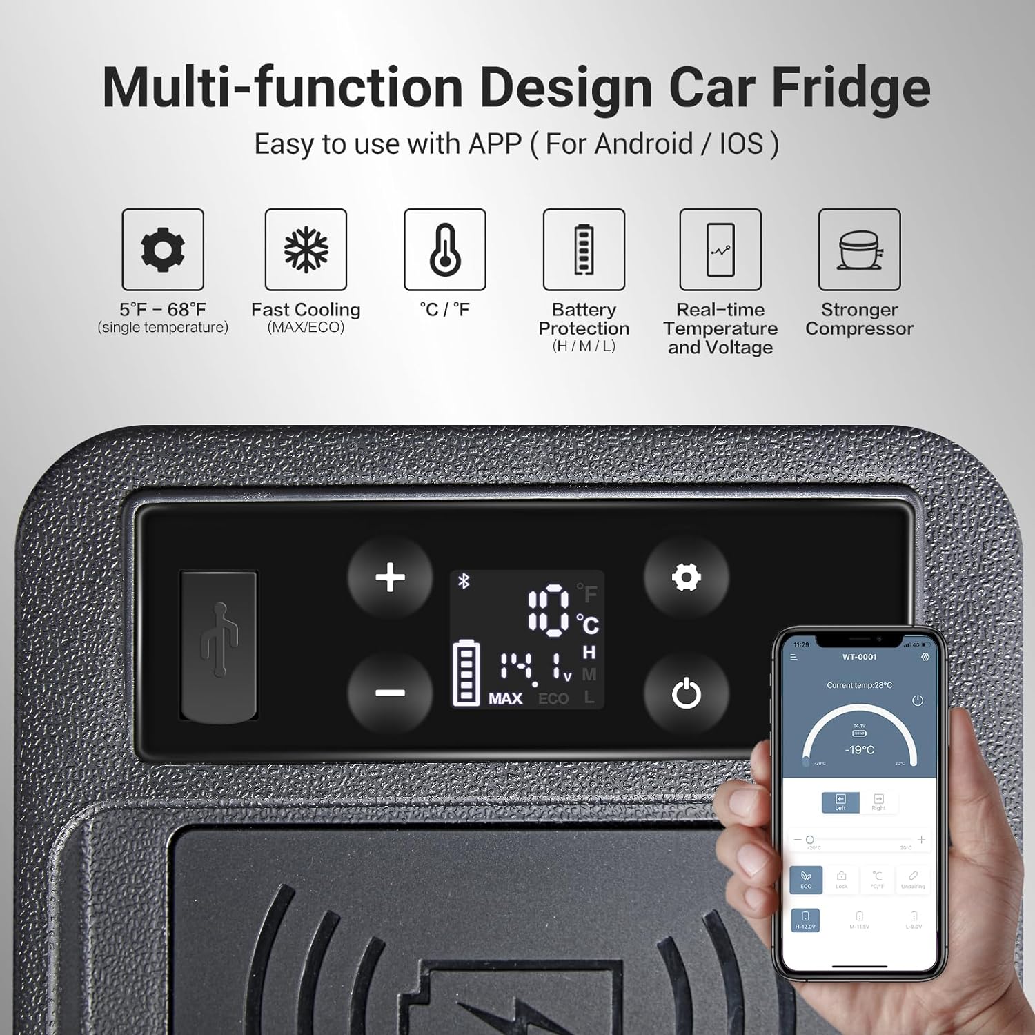 - 【APP Control & LCD Display】BODEGA 12v fridge has two convenient control options and the temperature can be easily set between 5℉~68℉.The LCD digital display of BODEGA portable fridge allows for easy monitoring of the temperature.The USB socket at the back for rear passengers' mobile phone charging