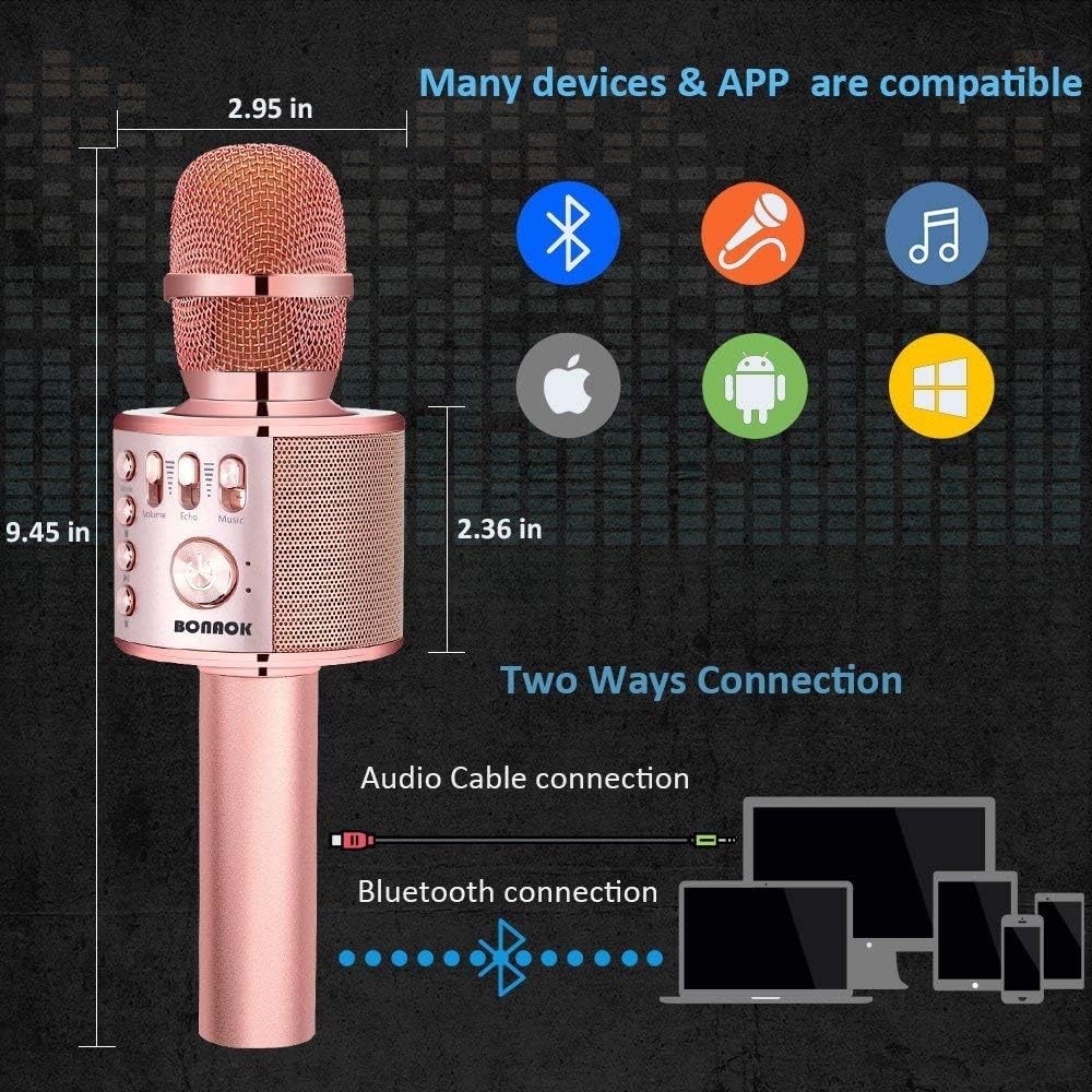 - MICROPHONE FOR KIDS & ADULTS: Come with 1* BONAOK microphone, 1* Audio Cable, 1*Charge Cable, 1*User Manual, and 1*Colorful Box; Cute gifts idea for kids, teens and adults, friends and family, suitable for all kinds of holidays and festivals