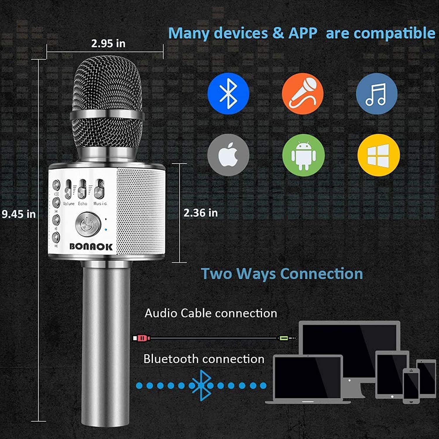 - TWO WAYS CONNECTION: Bluetooth Connection & Cable Connection; You just need to connect your phone with cable or Bluetooth, and then open the singing APP on your phone; The built-in clear audio and the vividly sound effect let you listen and sing anytime and anywhere