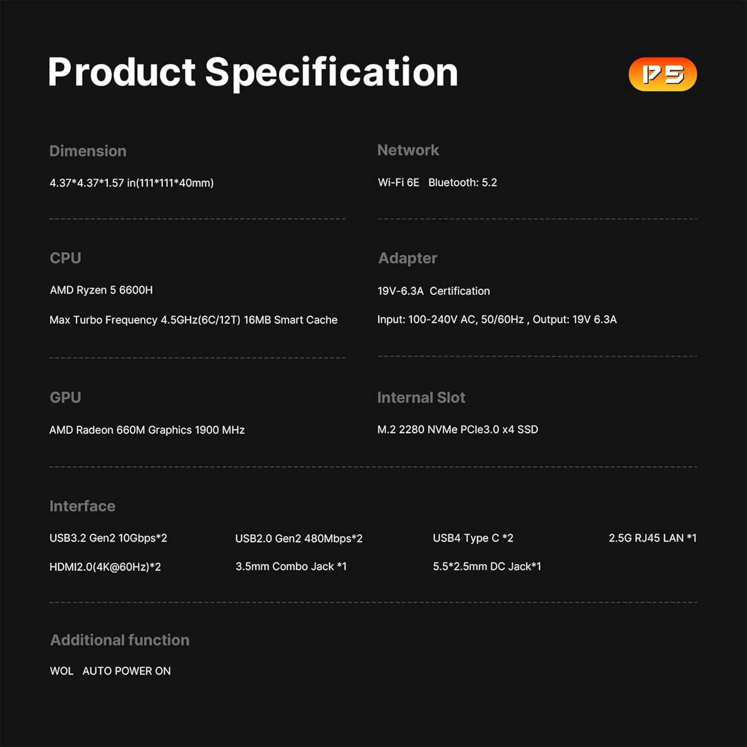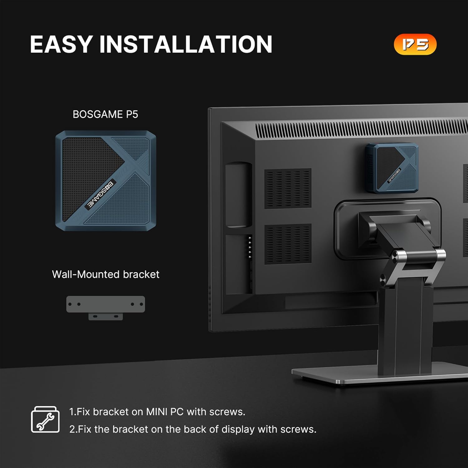 - 【Bosgame P1 support PD 3.0 via Type-C, Dual 2.5G LAN & WiFi 6E】 The Bosgame Mini Computers Type-C port supports PD 3.0 (up to 100W), meaning you can power the Bosgame P4 conveniently for portability. It features Dual 2.5Gbps LAN ports, enabling the use of more complex networks such as software routers, firewalls, NAT, and network isolation. The P1 Mini PC comes with the latest WiFi 6E technology, which is three times faster than Wi-Fi 5, and it's also equipped with the latest Bluetooth 5.2 for effortlessly connecting wireless devices.