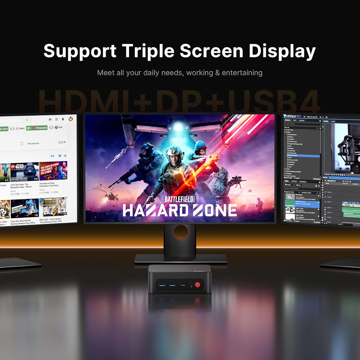 - 【Bosgame P1 Mini Computers Supports Triple Display 4K@60Hz】 The Bosgame Ryzen 7 Micro PC allows for triple displays via 1*HDMI2.0 1*DP and Type-C 4K@60Hz HD output, catering to the demands of daily design work and most low-power games. Run AI training, data processing, and media streaming simultaneously to enhance work efficiency effectively.
