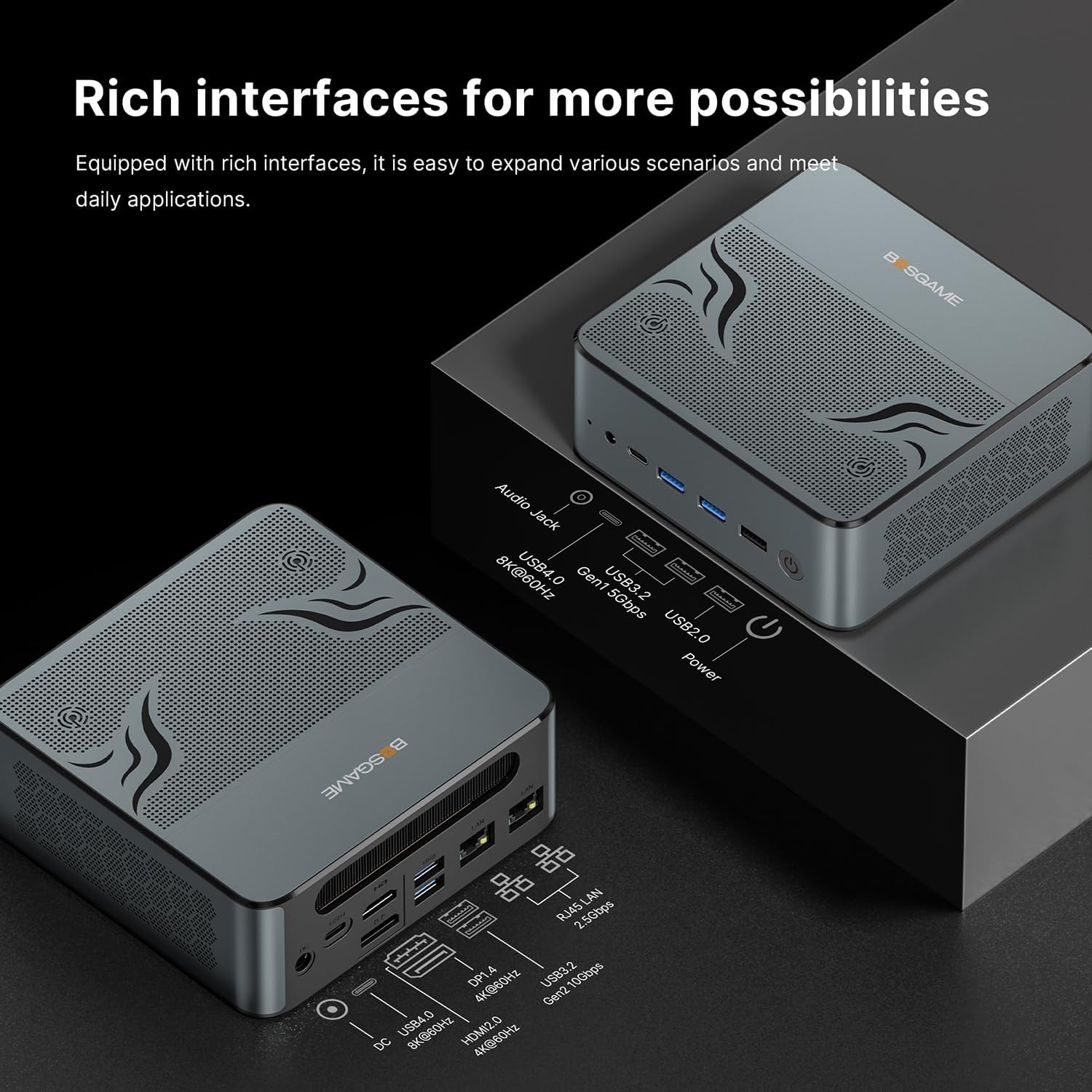 - 【Mini PC Ryzen 7 32GB RAM 1TB (1024GB) SSD】 The Bosgame P4 Mini Computers is equipped with dual-channel 32GB (16GBx2) memory, expandable up to 64GB. It includes a 1TB M.2 2280 PCIe SSD, with scalability up to 2TB storage, and also supports an expansion for a 2.5-inch SSD. The 32GB RAM unleashes the full potential of the Radeon graphics, providing a faster response for both gaming and design data processing. The 1TB SSD offers ample space for more files, such as AI training data and AI design models.