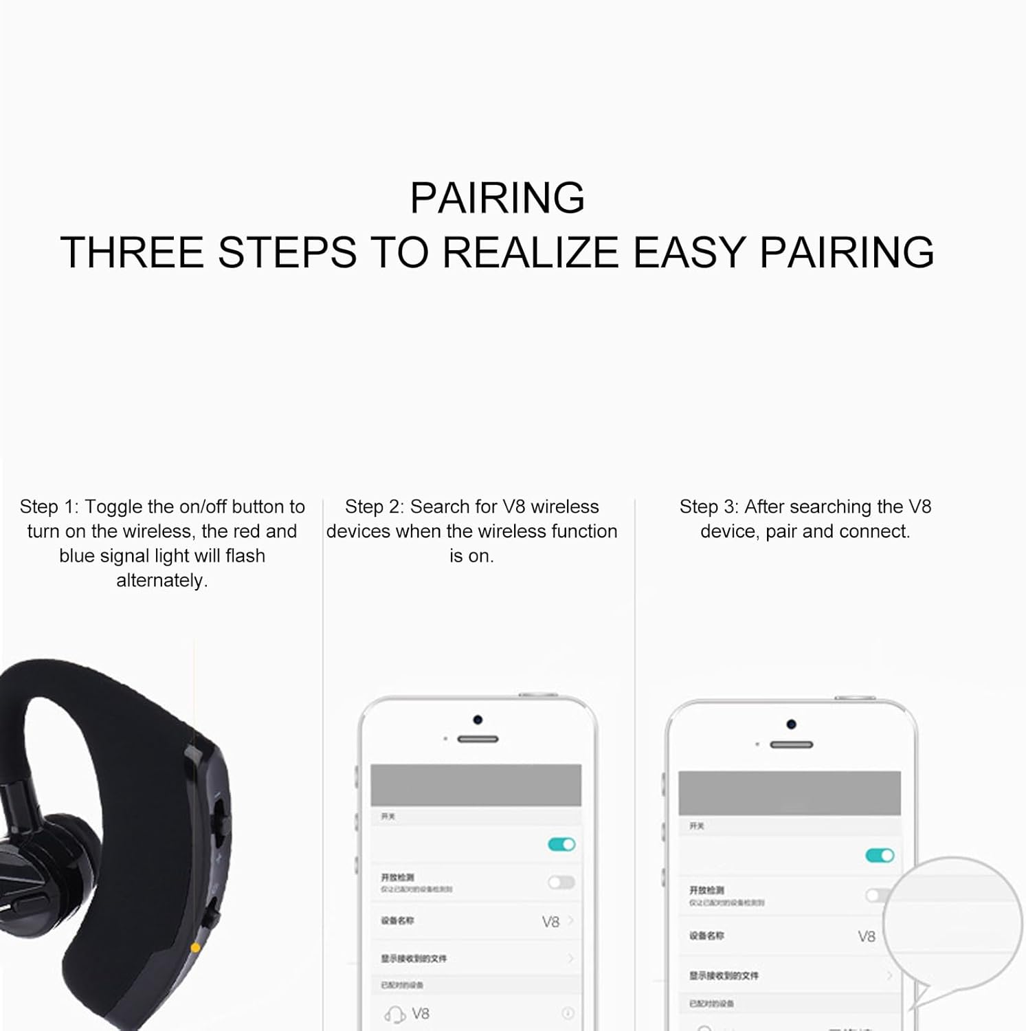 AUTOMATIC PAIRING: When single ear BT headset first BT pairing, just turn on the BT of your cell phone and headset, it will connect automatically. Pairing is secure and simple.