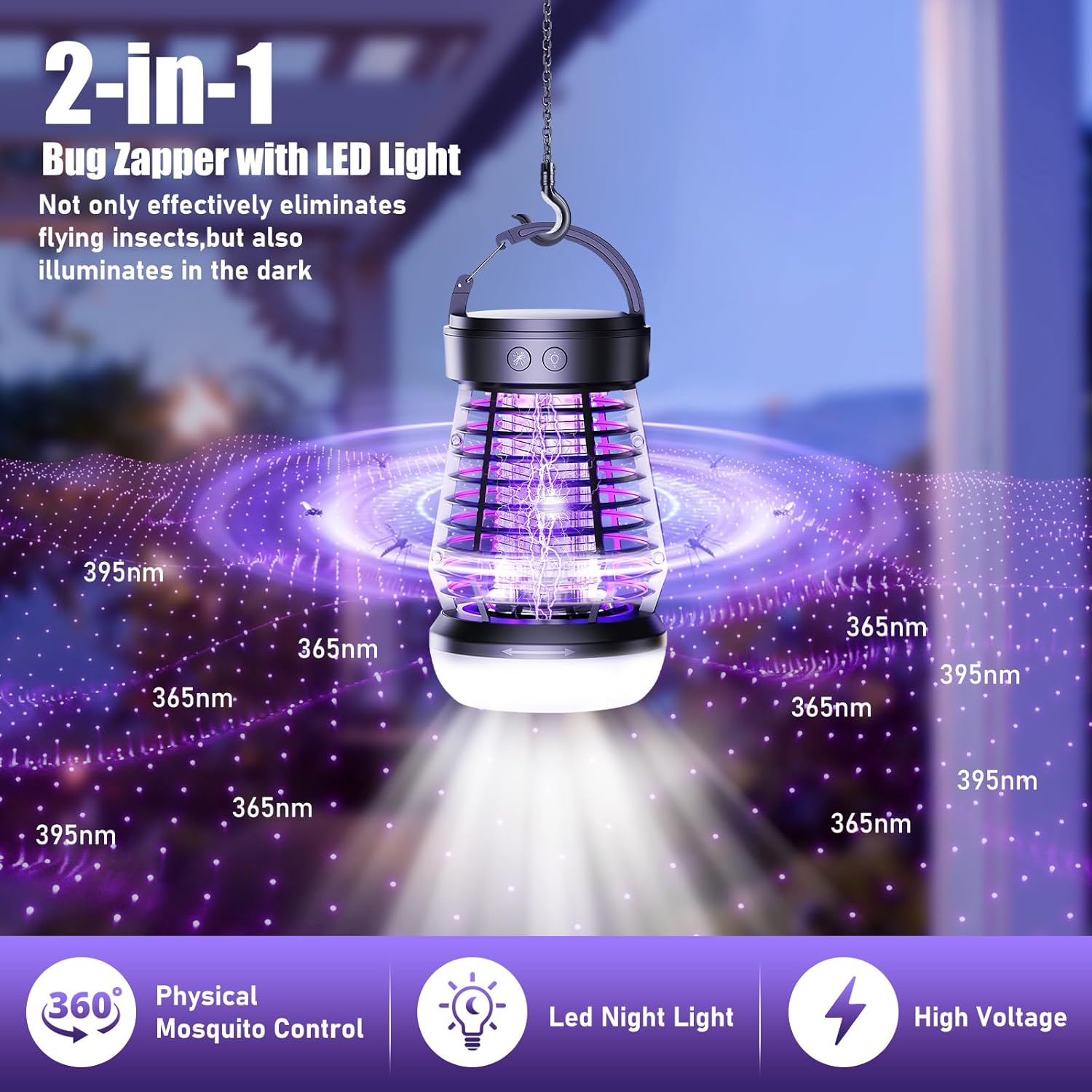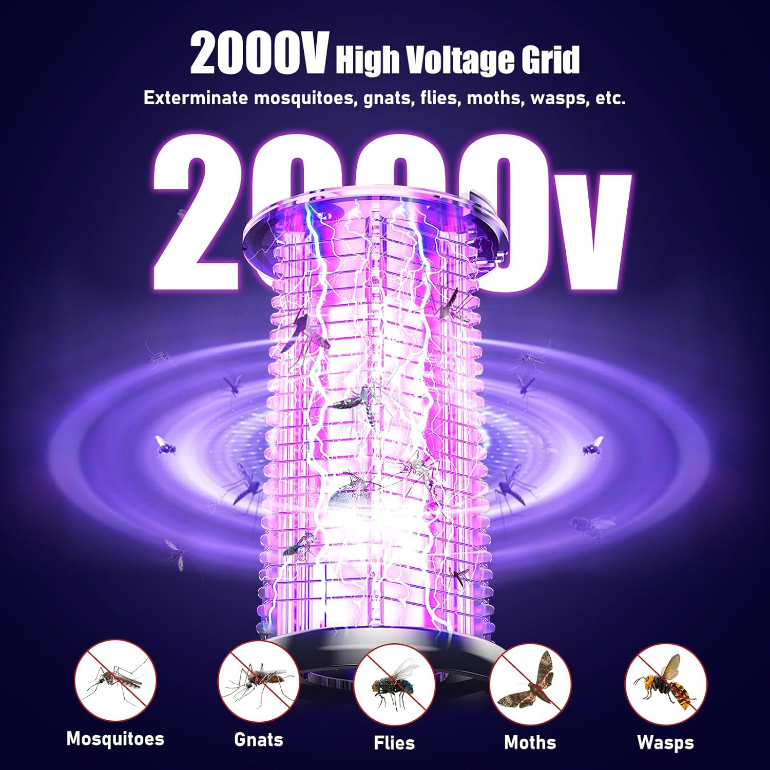 - 【High Effective Mosquito Zapper Lamp】This mosquito killer outdoor attract insects by its heat and 360°range 365-395nm wavelength purple attractant light, then shock them by 2000V high-voltage electrical grid in physical method, it can effectively kill mosquitoes, flies, moths, gnats, wasps and other flying insects. Protects you and your family from pest infestations.