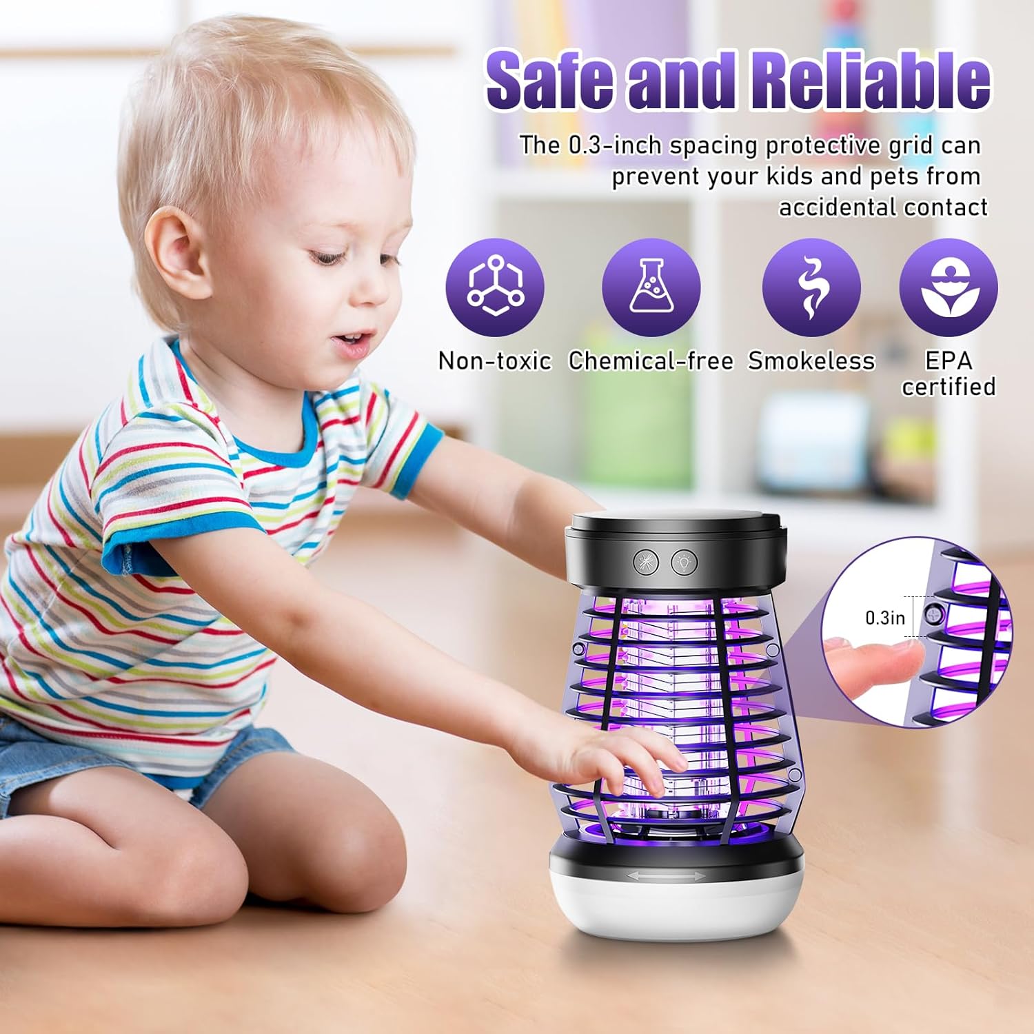 - 【Safe and Reliable】Our indoor bug zapper lamp features a rugged ABS Housing with no-toxic and odorless. Designed with a 0.3-inch spaced safety barrier, the grid is secured within a plastic fence that keeps fingers out of reach. This feature ensures that children’s hands and pets are kept away from the electric grid, adding an extra layer of care.