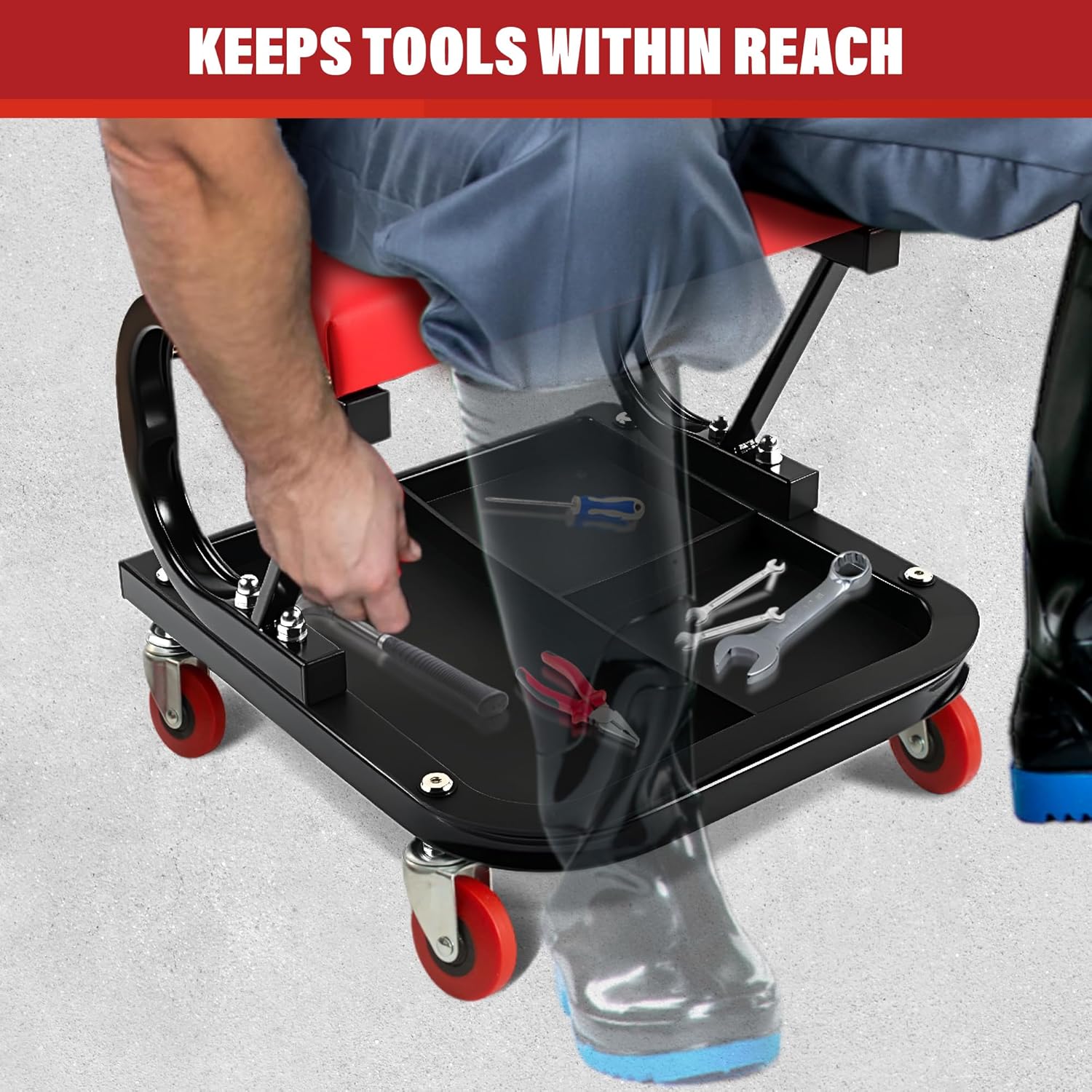 Designed for seamless mobility, the seat features four 360° swivel casters that glide smoothly across garage floors, workshop tiles, and other surfaces. An integrated tool tray with three compartments keeps essential tools within easy reach, helping you stay organized and work faster. At a convenient 14.2-inch height, this stool is ideal for vehicle repairs, home projects, and general maintenance tasks. Its lightweight design makes it easy to move around your workspace, offering practical support wherever you need it.