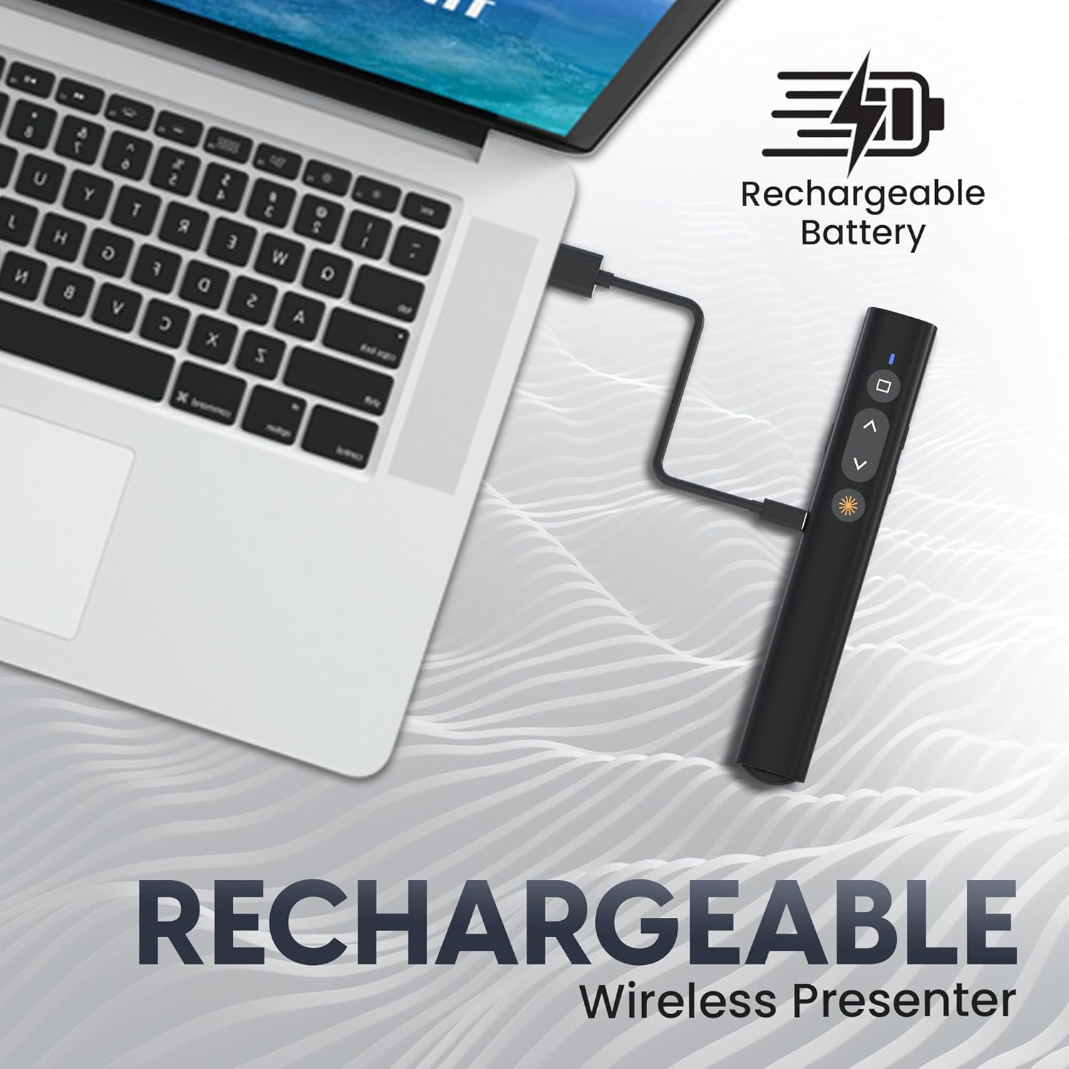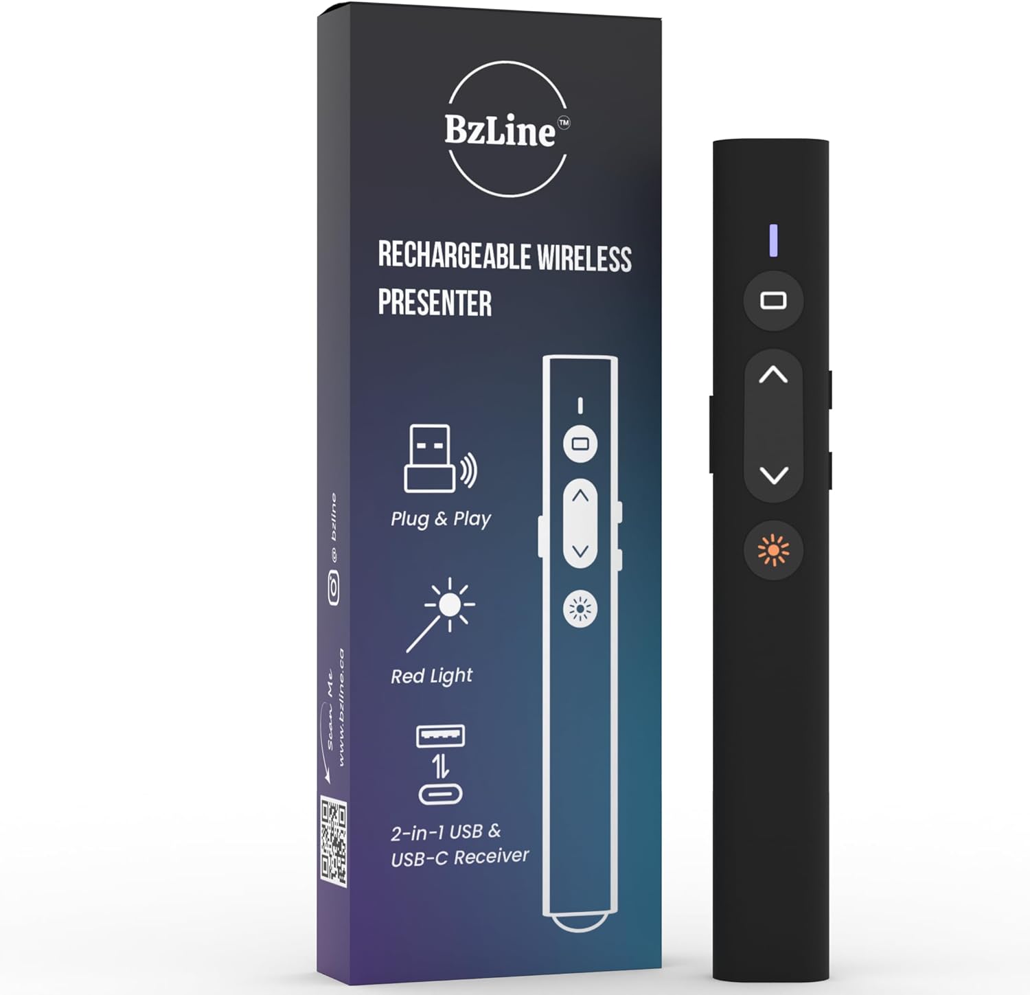 BzLine [Rechargeable] Presentation Clicker and Laser Pointer | Slide Advancer for Powerpoint, Google Slides | Long Range, USB & USB-C | Compatible with Mac/Windows | Volume Control - Built-in Battery