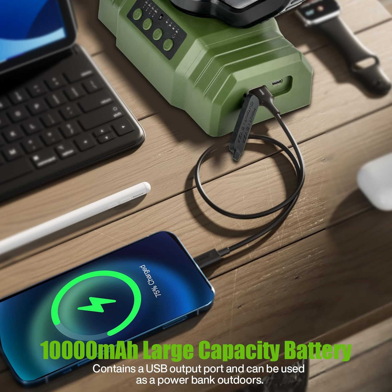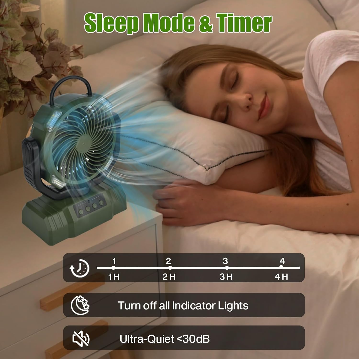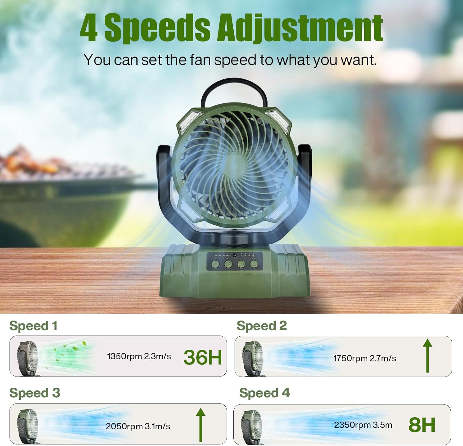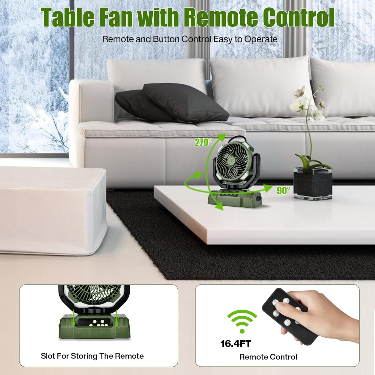 Camping Fan with LED Light, 10000mAh Rechargeable Battery, 4 Speeds & Timers - Portable Desk Fan with Remote Control for Camping, Emergency, Jobsite (Green)