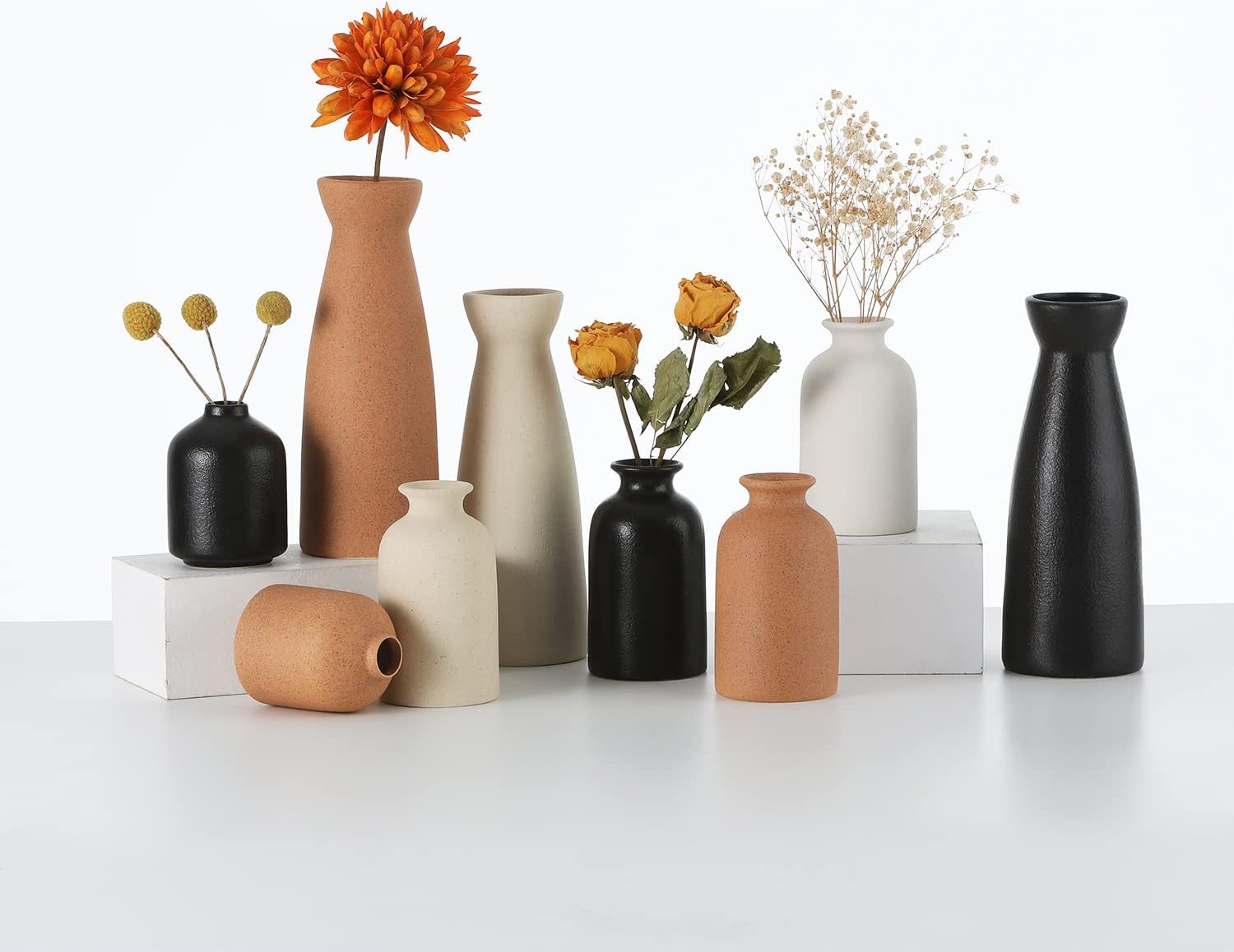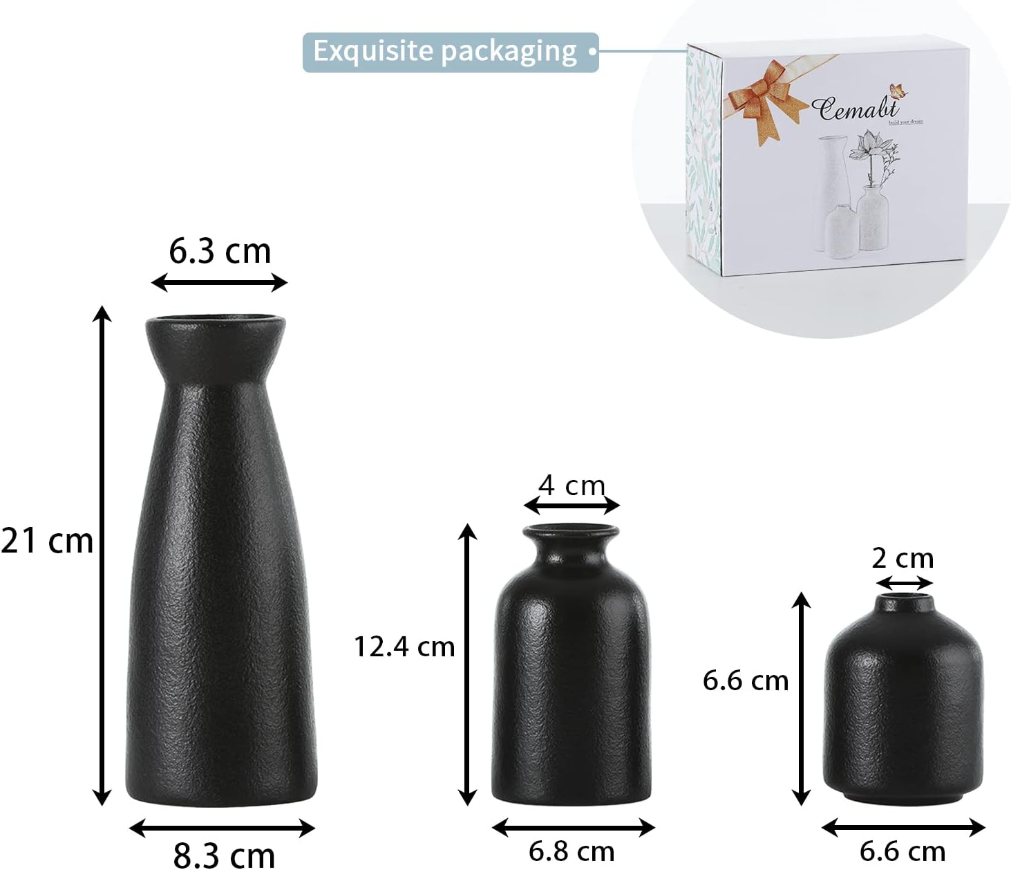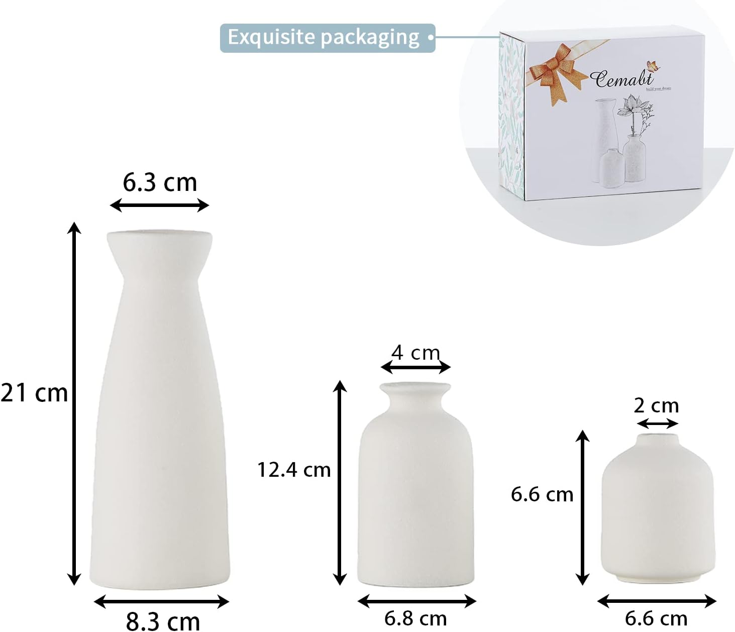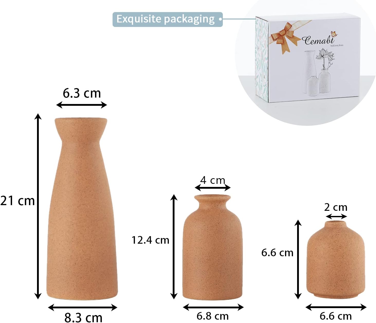 - Minimalist Design:This vase set with stylish shapes perfectly fit all Decor styles,Each small vase varies in size measuring at 8.3"H x 3.1"W(Pampas vase), 4.9"H x 2.8"W(small vase), 4.0H x 2.9"W(bud vase).small vase set, not large.(we only sell vases)