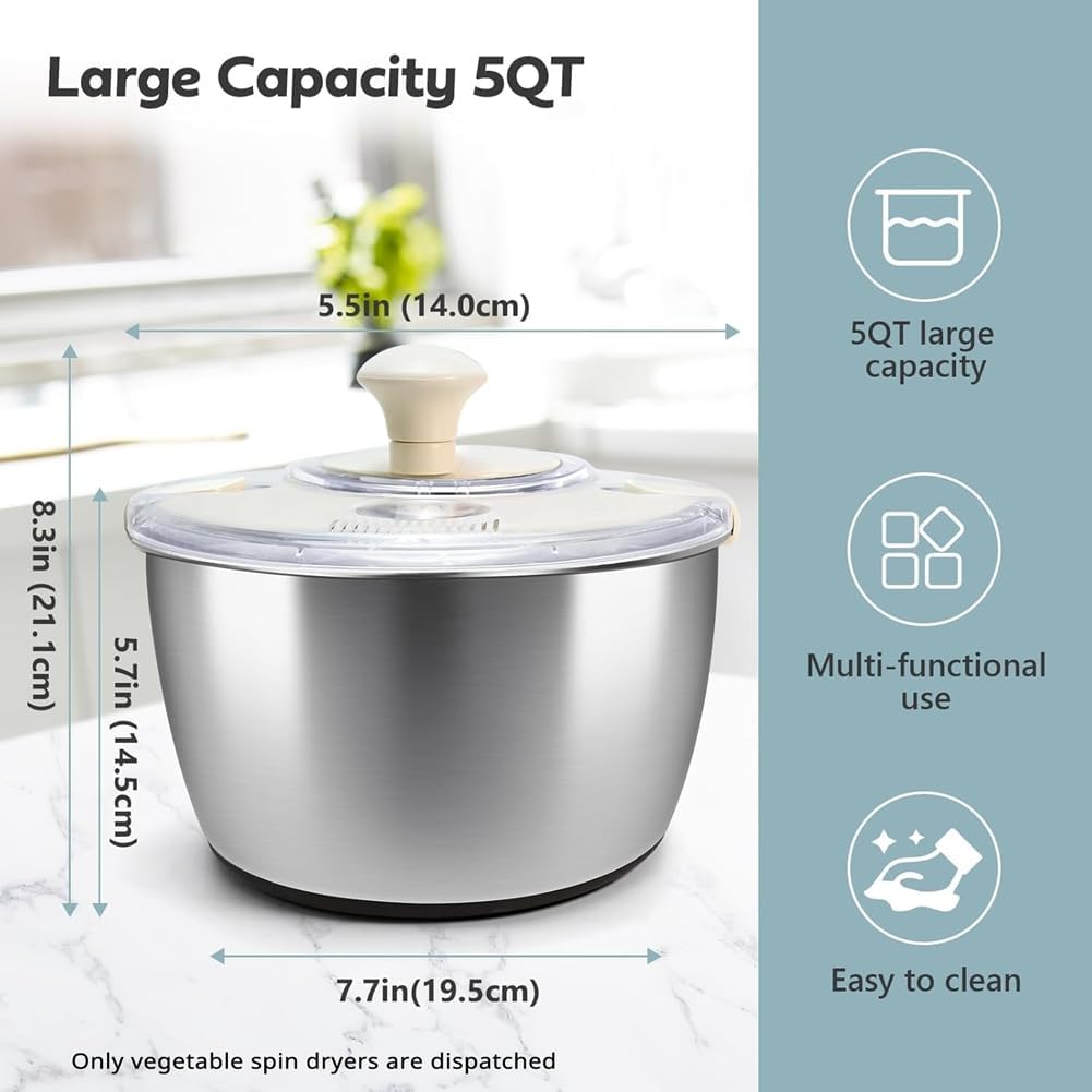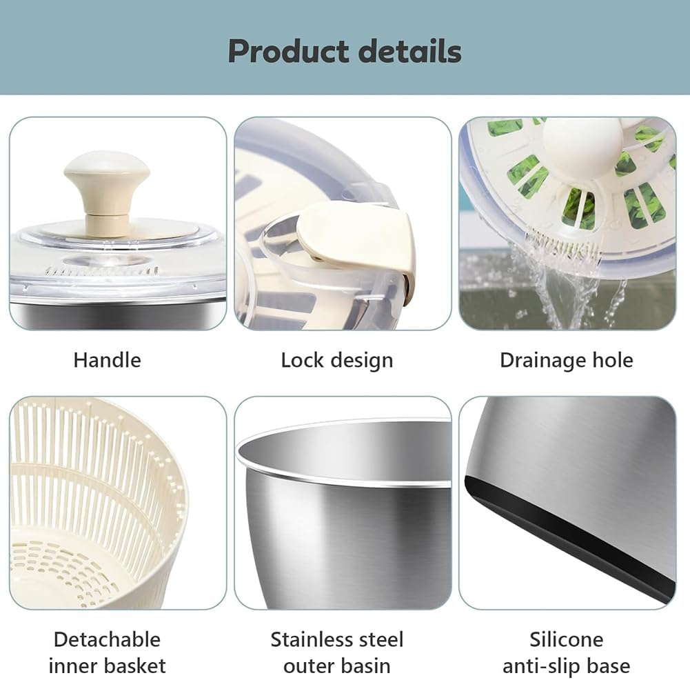 Frame Non-Slip BaseCenroelon Stainless Steel Salad Spinner - lettuce spinner With lid, basin, drain frame and non-slip base,Compact Manual Spinner with Quick ,Spaghetti & Chip Strainer,Easy Clean,5qt