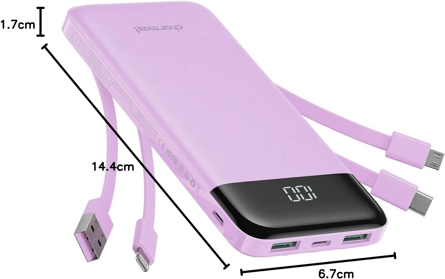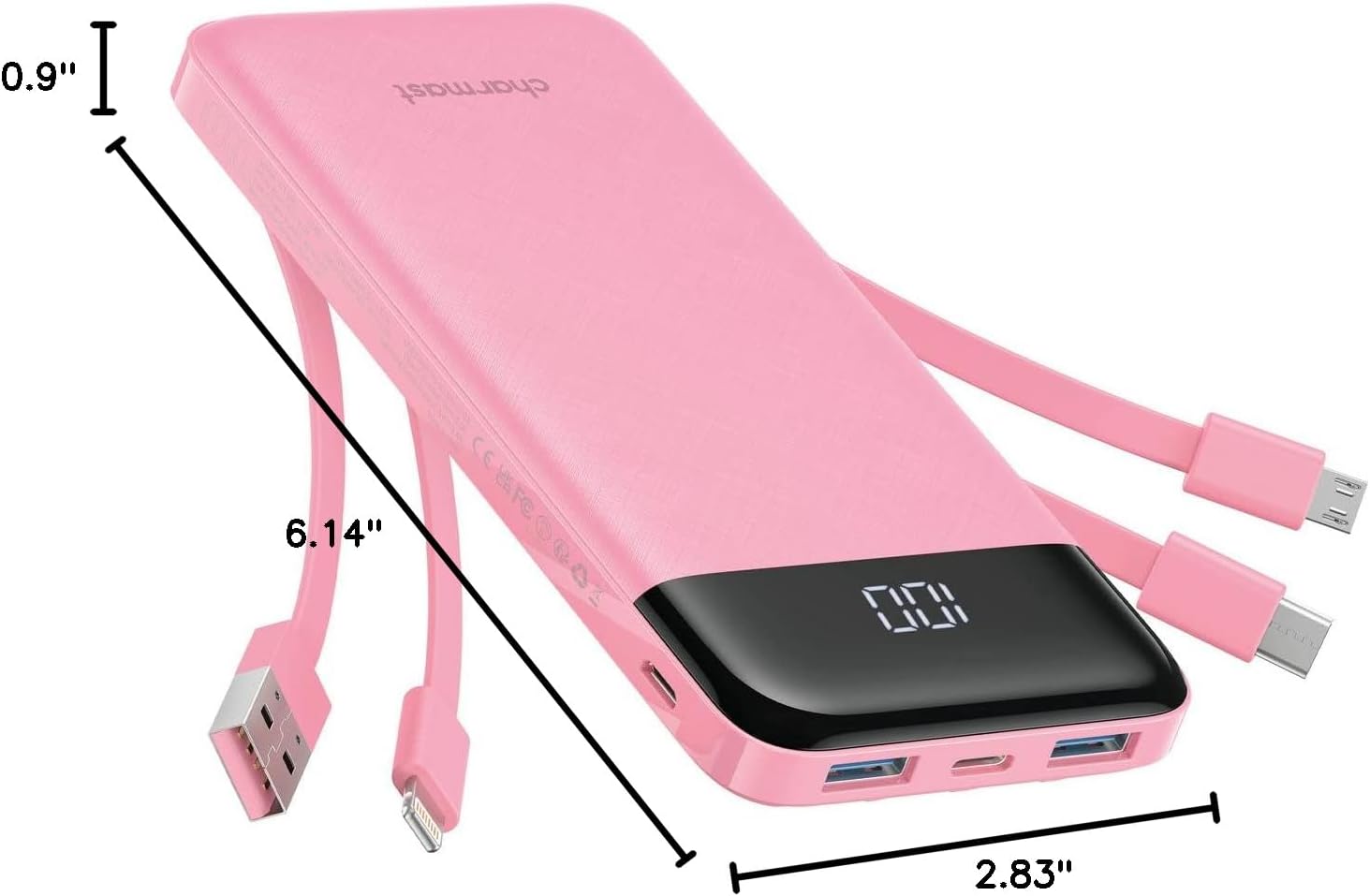 - Charmast Portable Charger with Built in Cables, Power Bank with Cords Wires, Slim 10000mAh Travel Battery Pack 6 Outputs 3 Inputs 3A Fast Charging for Samsung Google Pixel LG Moto iPhone iPad