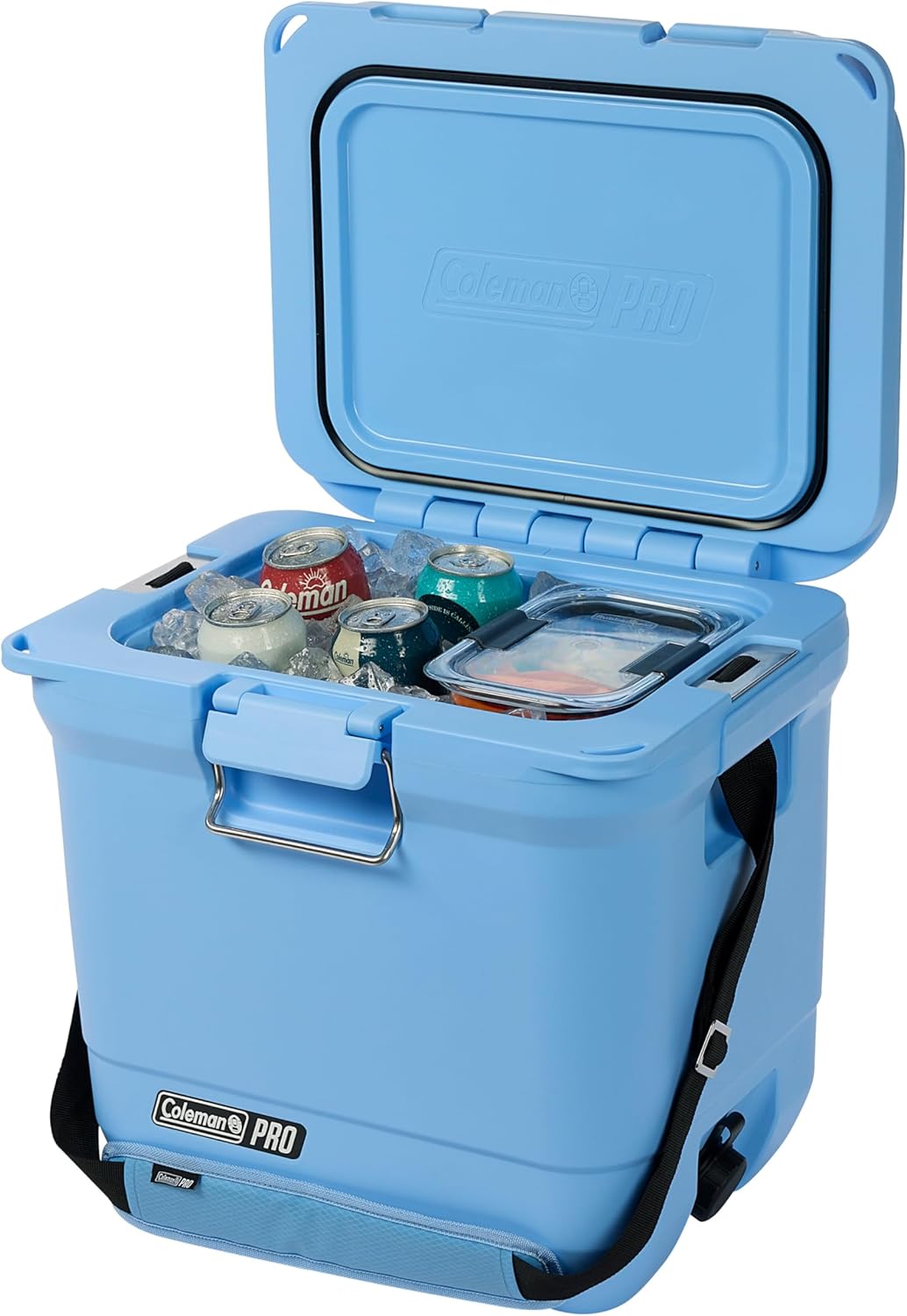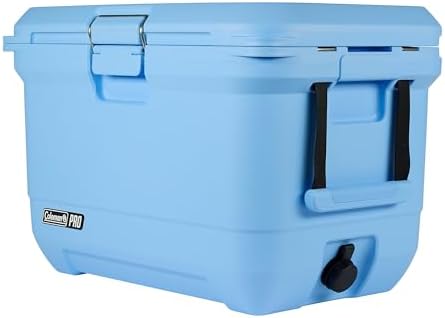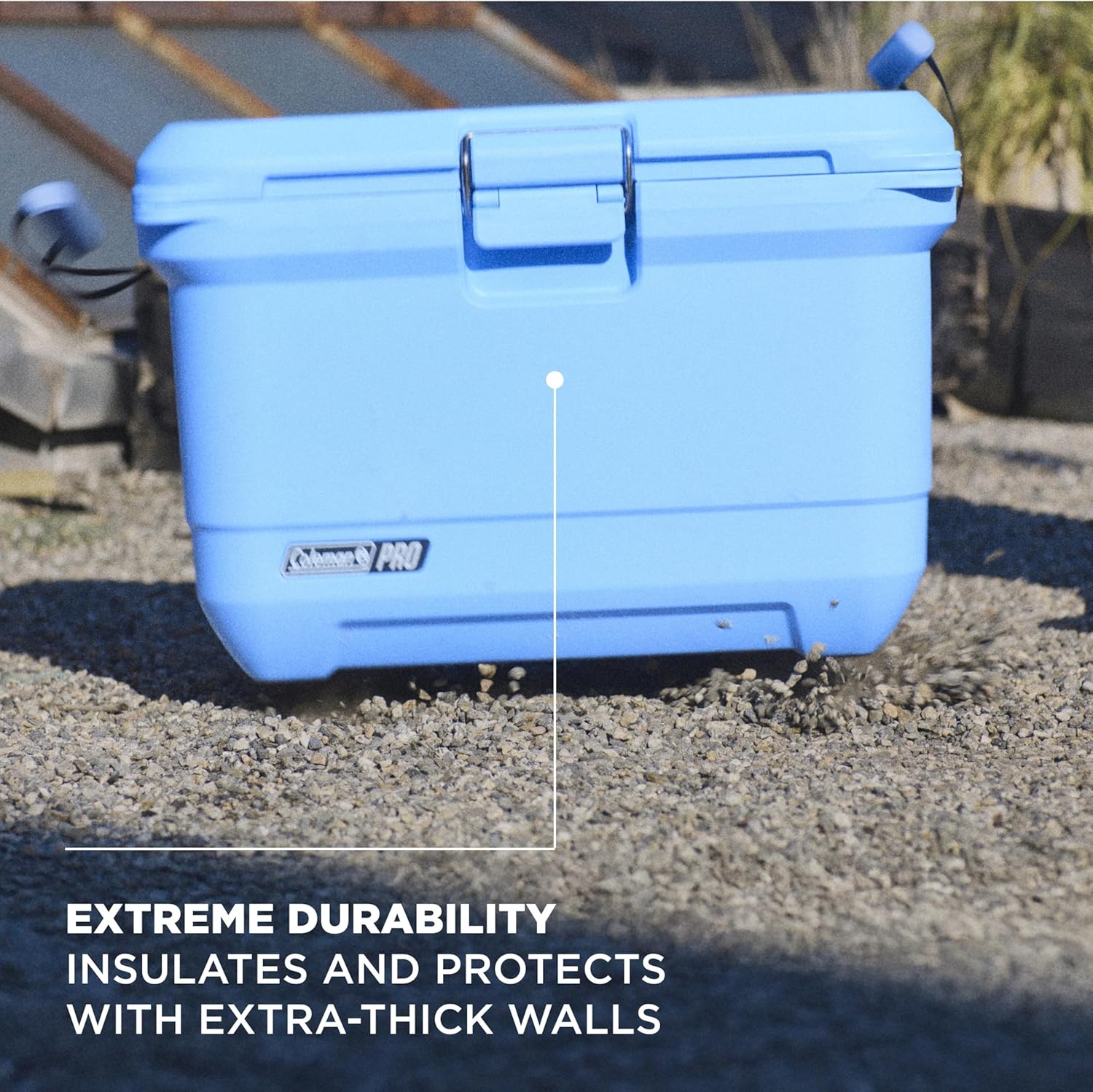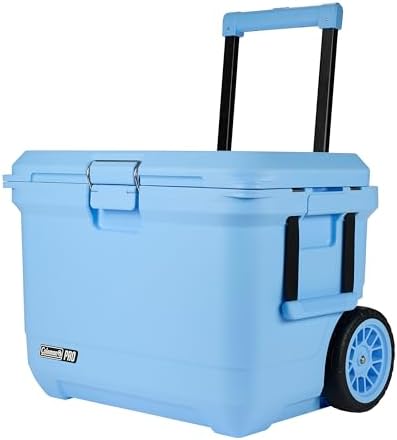 Coleman Pro Heavy-Duty Ultra-Light Premium Hard Cooler, 92/74/36-Can Capacity, Extra-Thick Insulation Keeps Ice up to 5/4/3 Days, 55-Quart Wheeled Cooler or 45/25 qt (No Wheels), Blue Sky