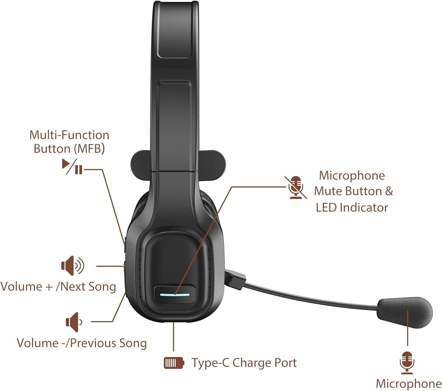COMEXION Trucker Bluetooth Headset V5.0, Wireless Headset with Noise Canceling&Mute Microphone for Cell Phones, On Ear Bluetooth Headphone for Computer, Zoom Meetings, Skype, Home Office