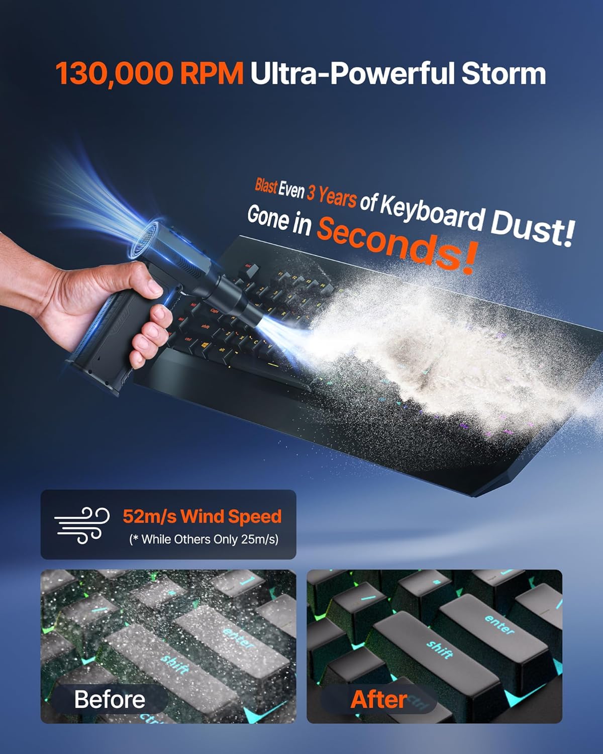 • Ultra-Powerful 130,000 RPM Motor: Generates 52 m/s airflow to remove dust quickly and efficiently.