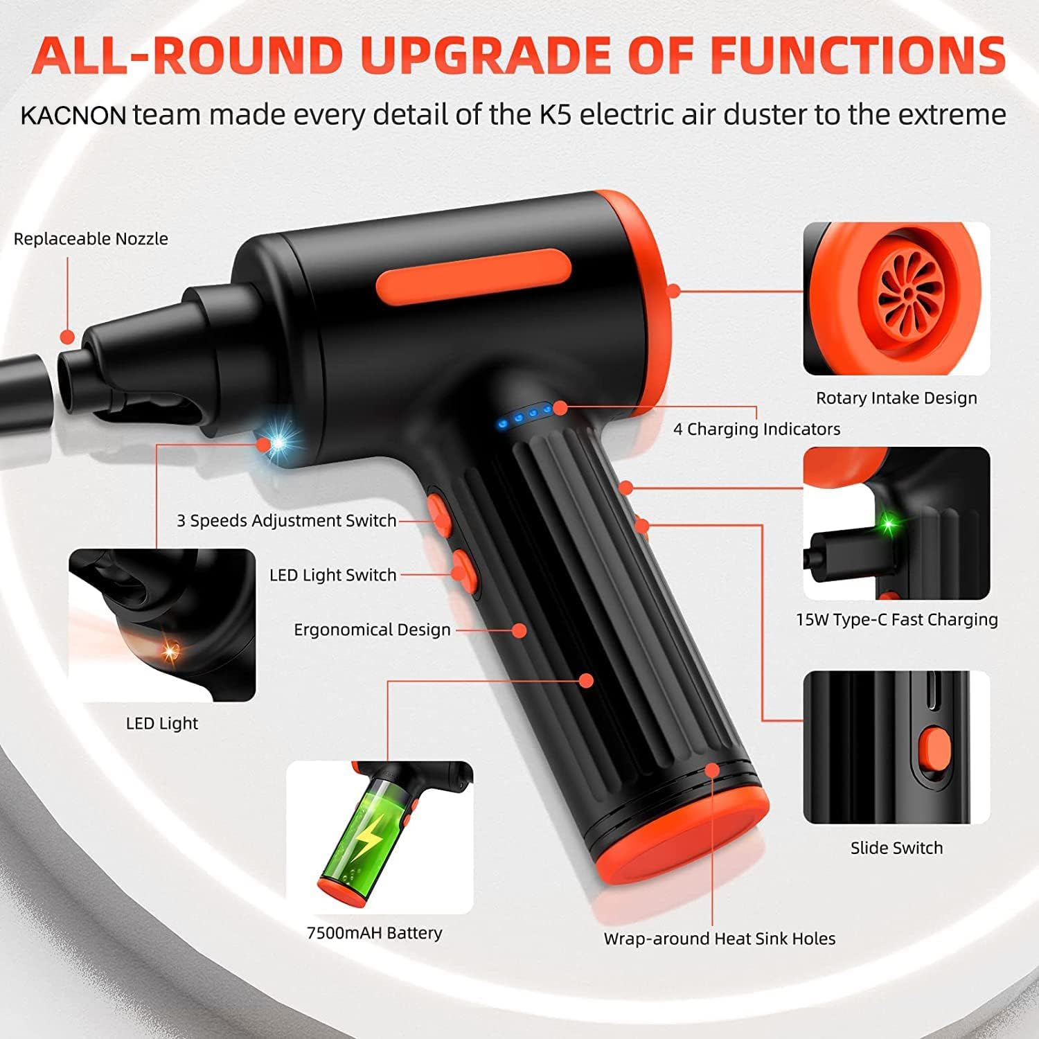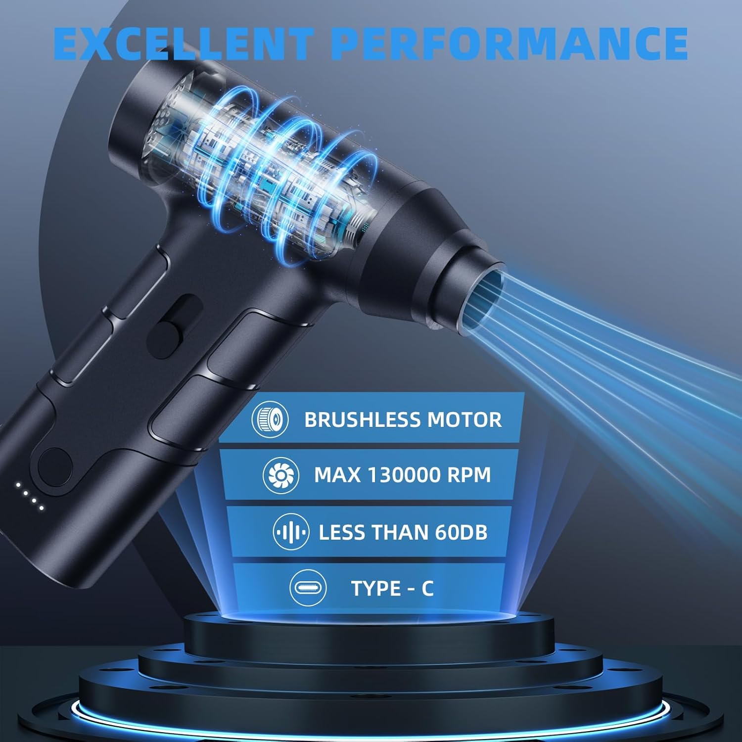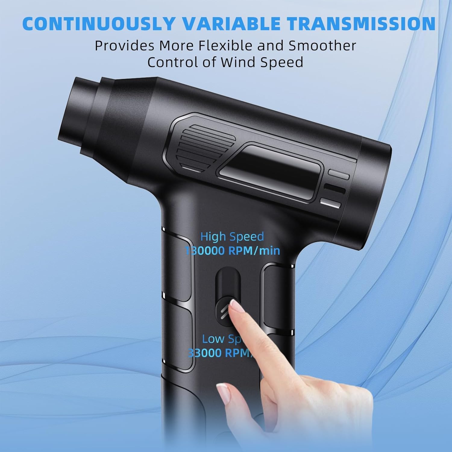 - Upgrade Air Dust Blower: The compressed air duster provides more powerful wind power, up to 130000 RPM, and provides super strong air flow for deep cleaning. Long Press to start the power, you can switch three air flow modes (70000 RPM, 90000 RPM, 130000RPM) for different equipment cleaning, so that there is no place for dust to stay.
