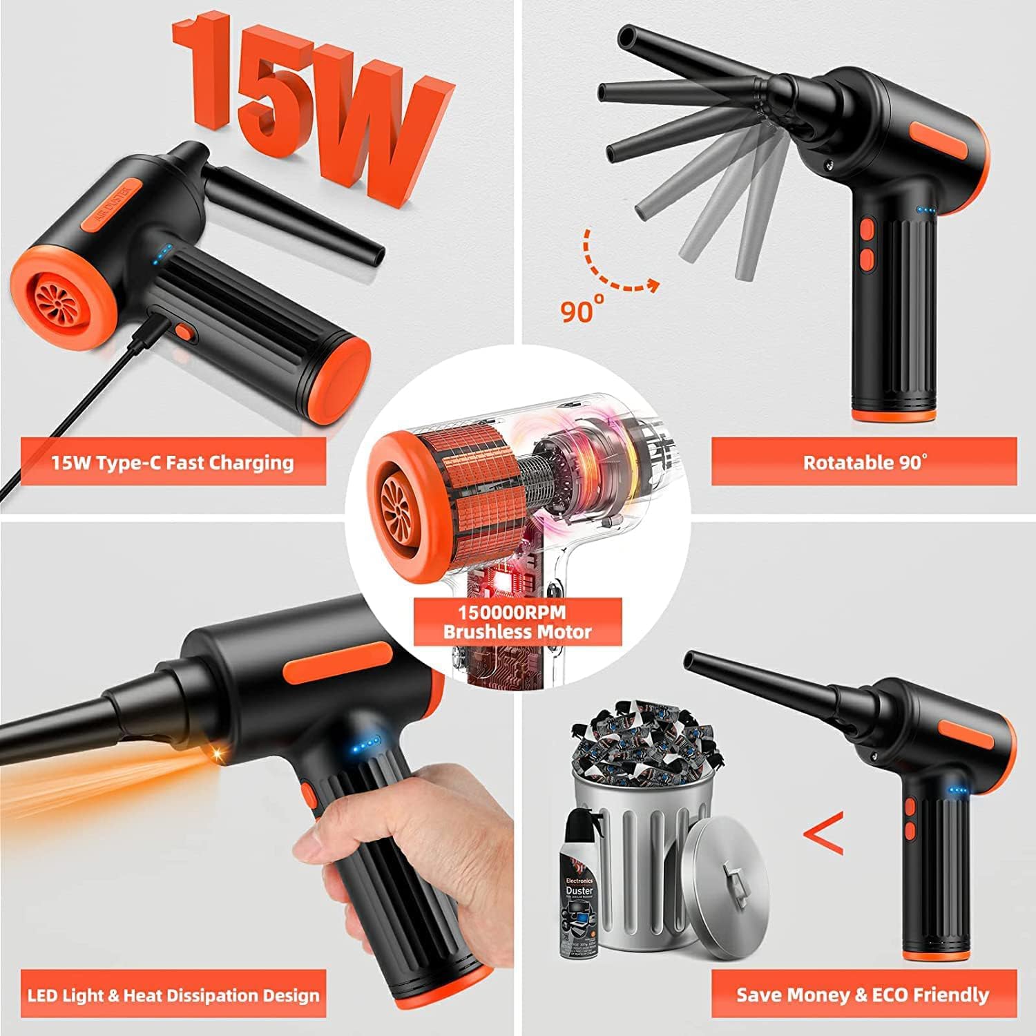 - Economical & Energy Efficient: Compared with compressed air can, our cordless air duster do not produce chemicals, liquids or ice during the cleaning process. It protects your electronics from liquids. The air blower be used multiple times, it saves you money and protects the environment.