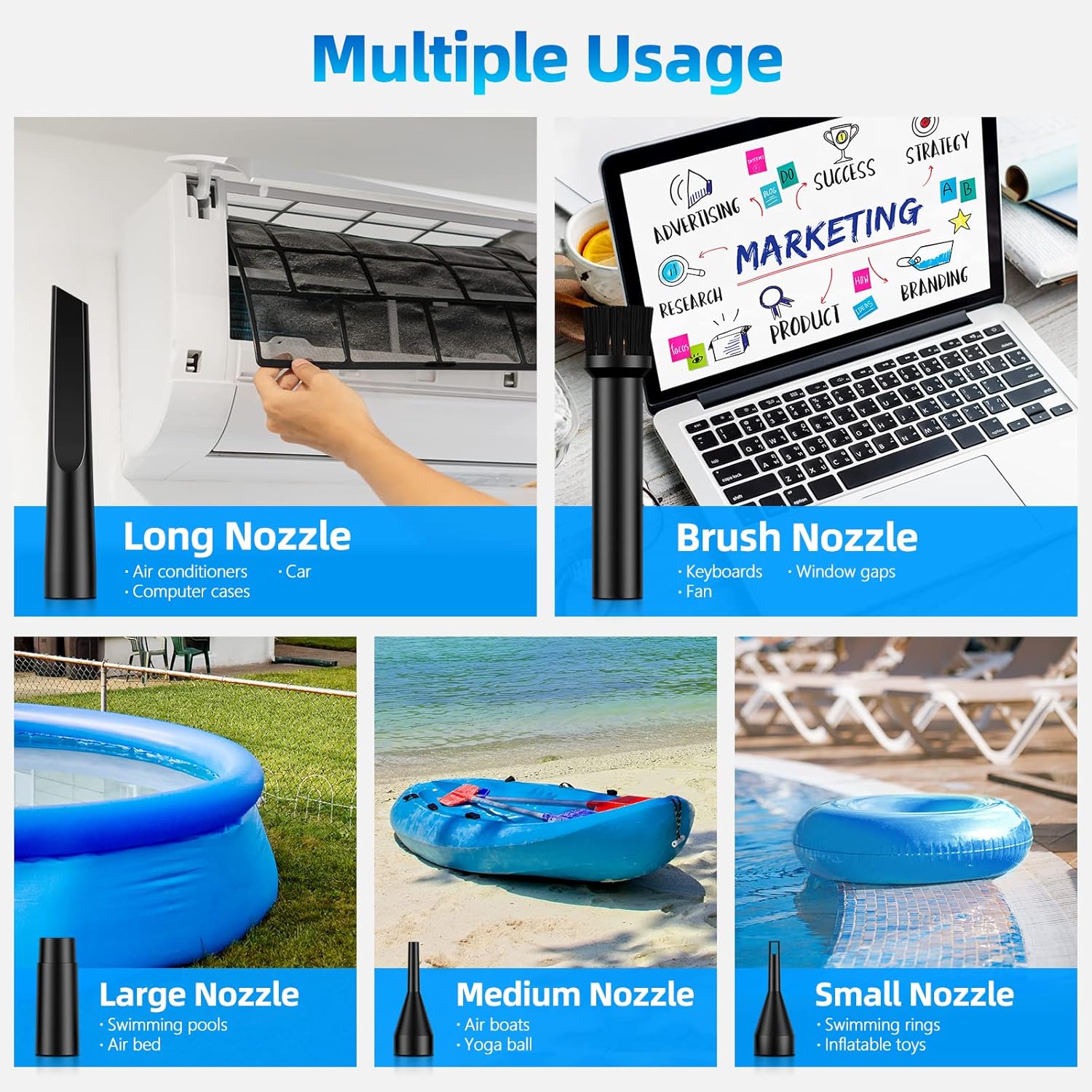 - Multiple Uses: The compressed air is equipped with 5 sets of nozzles to meet different needs. It is suitable for dust removal of computers, keyboards, cars, air conditioners, lily windows, etc. Multi-functional nozzle is used to inflate swimming circles, yoga balls, steam boats, air cushions, inflatable toys, etc.