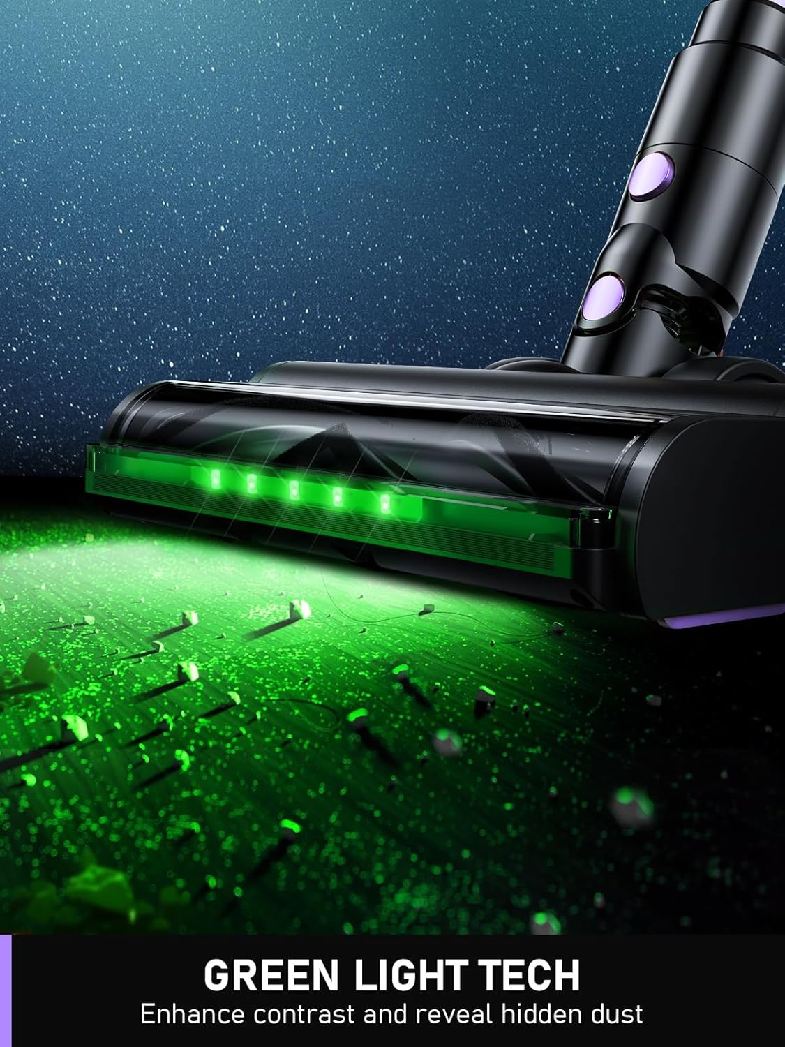 Anti-entanglement & Green LED Light: The floor brush head of this vacuum cleaner adopts a V-shaped anti-entanglement floor brush, which effectively reduces the problem of pet hair entanglement and is an ideal choice for pet families. It is also equipped with a green indicator light. The hair and dust on the ground can be seen with the naked eye, helping you easily clean inconspicuous debris on the ground.