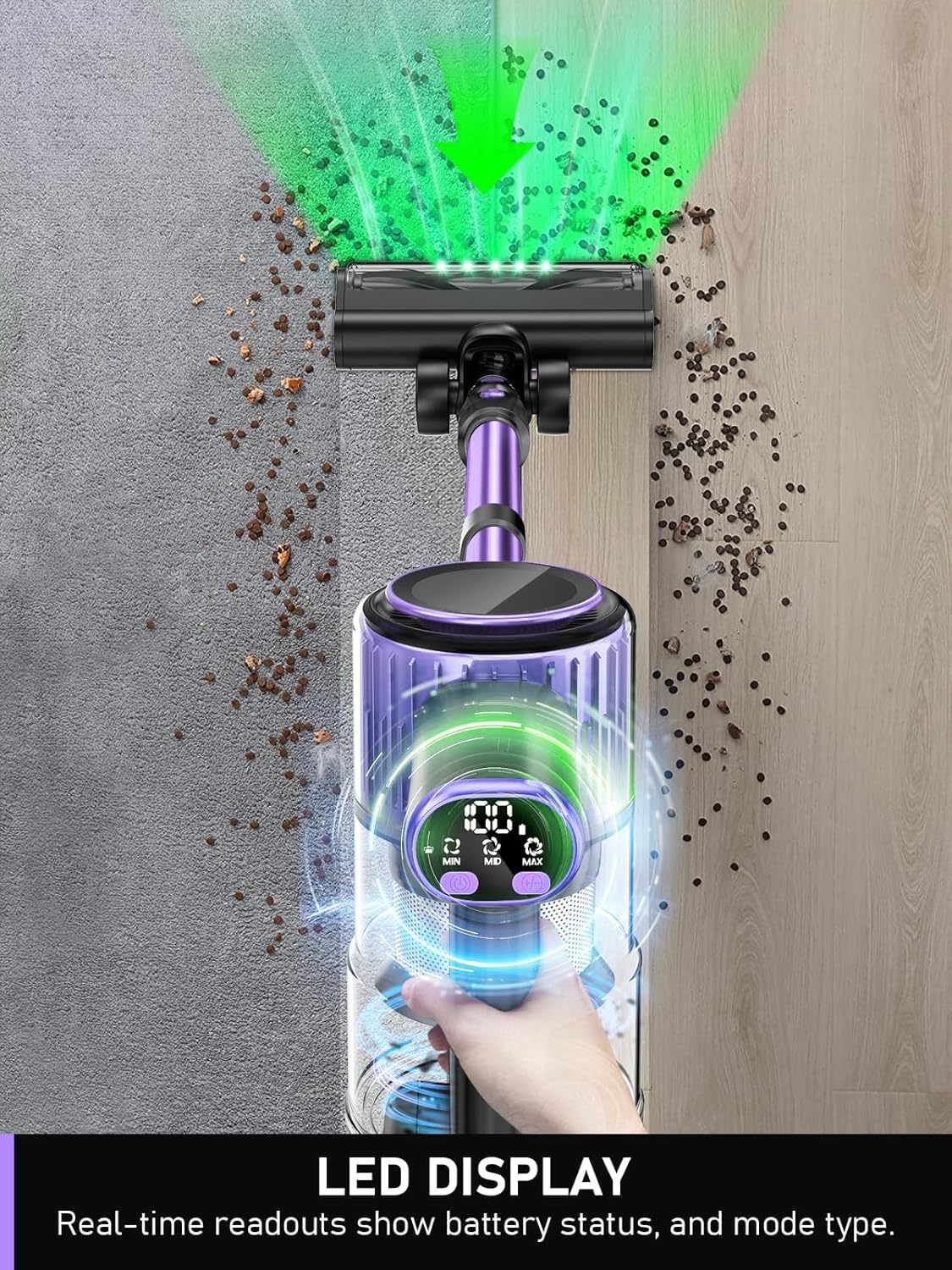 Smart Display: The cordless stick vacuum screen has only two buttons, one for turning on and off, and the other for adjusting the suction power. The screen can monitor the power level, suction mode, and whether the brush head clogging prompt function in real time, so you can intuitively understand the operating status of the machine. Simple operation, even the elde
