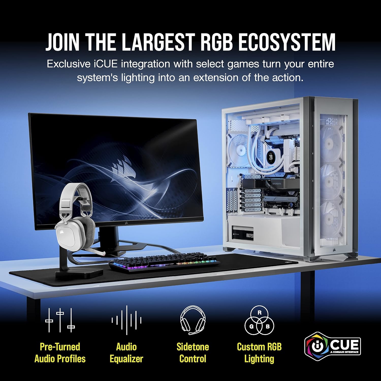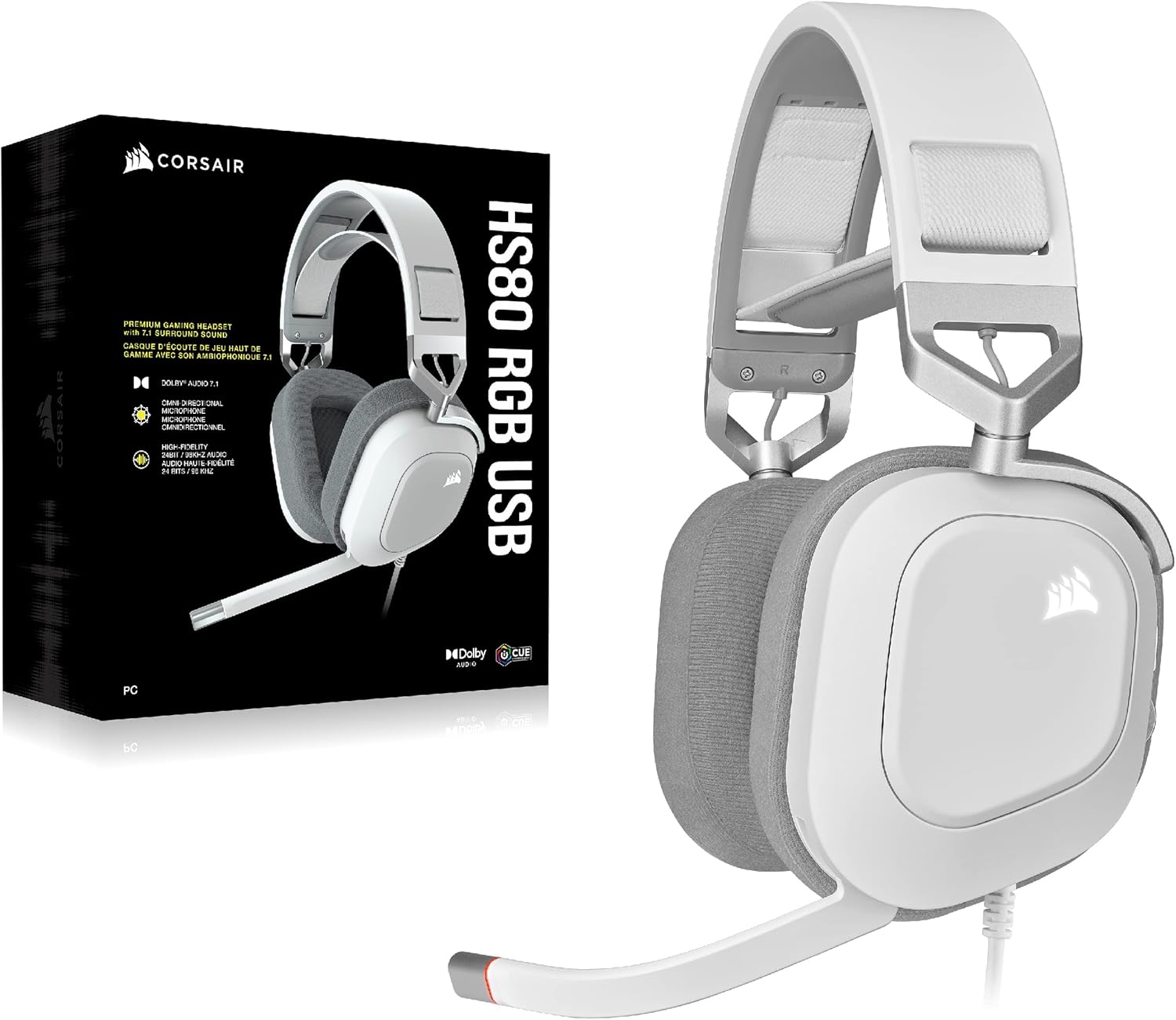 The CORSAIR HS80 RGB USB Gaming Headset delivers incredibly detailed sound through custom-tuned 50mm neodymium audio drivers. Dolby Audio 7.1 surround sound puts you in the middle of the action, while a broadcast-grade omni-directional microphone captures your voice with outstanding clarity. Play in plush comfort with memory foam earpads and a stress-free floating headband design, with years of durability thanks to sturdy construction reinforced with aluminum. A USB wired connection offers high-fidelity 24bit/96kHz sound. Powerful CORSAIR iCUE software enables in-depth customization of audio settings and RGB lighting, letting you hear every shot, step, and shout like never before.