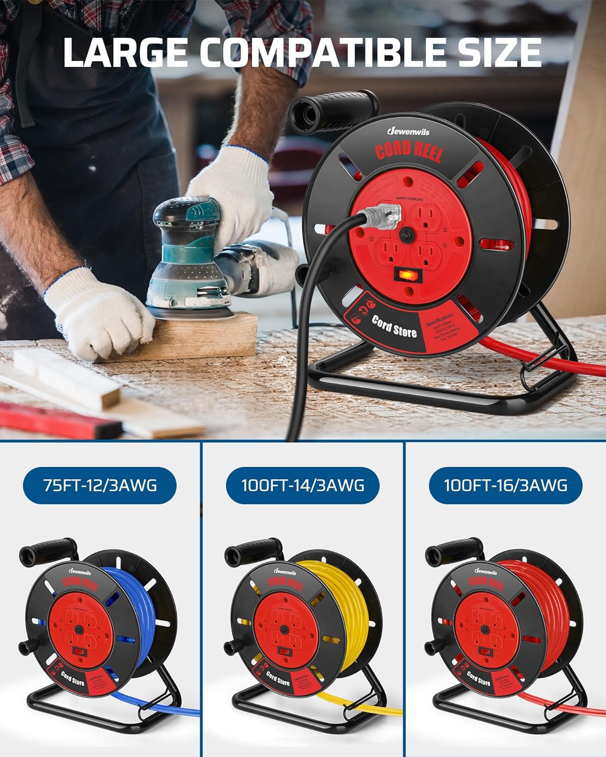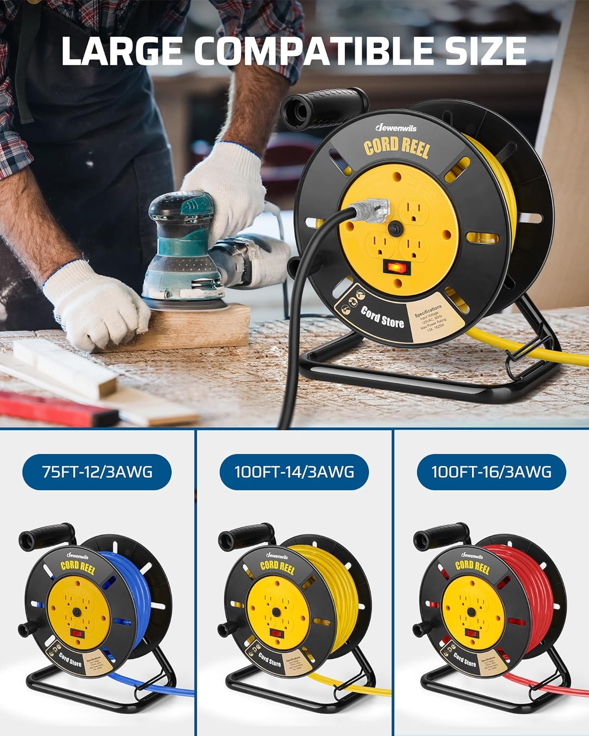 - [Wide Application & Easy to Use] This open cord reel is a versatile and robust solution for powering your garage, backyard, warehouse, or any space requiring electrical connectivity; holds up to 100ft of 14/16 gauge cord, or 75ft of 12 gauge cord; vertical stand design allows it to occupy minimal space
