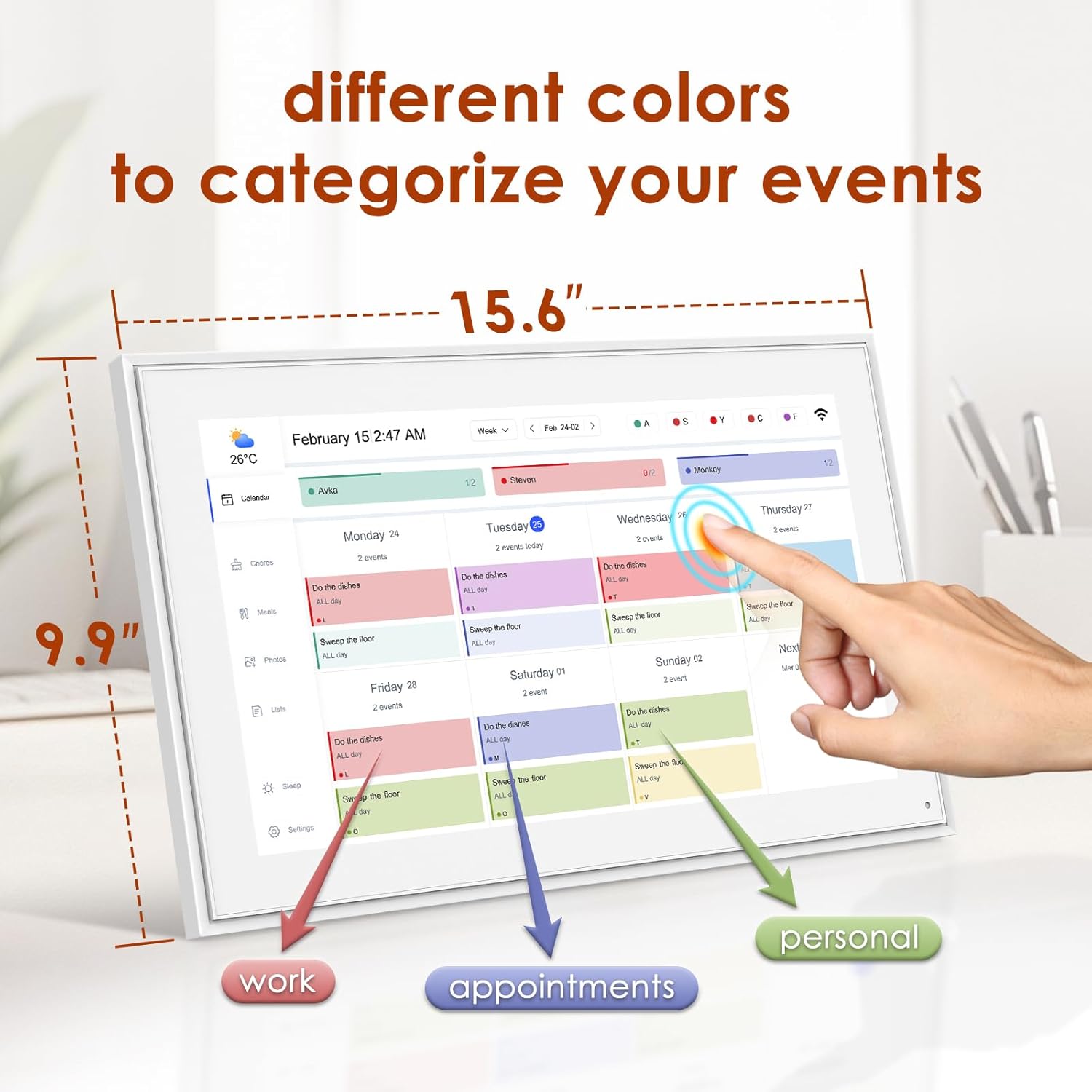 Simplify your life and streamline your family’s schedule with the Purilite Select 15.6-Inch Digital Calendar—a modern, intuitive, and interactive planner that brings organization into clear focus. With a 1920x1080P full HD IPS touchscreen, this smart scheduler lets you manage your entire week or month at a glance, making it easier than ever to stay on top of appointments, chores, and to-do lists.