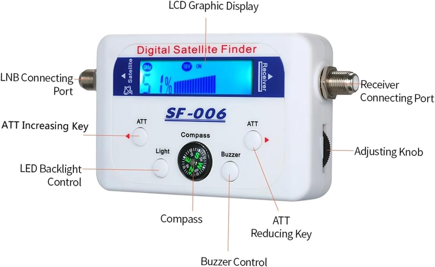 The digital satellite finder is microprocessor controlled, making it very reliable and accurate. Signal strength is presented graphically on the LCD display in form of thermometer-scale and in numbers (0-99). It can also present pitch tones (the higher tone the better signal) on a buzzer. The digital satfinder is very sensitive and can detect the weakest of signals, strong incoming signals (powerful satellite, big dishes) can easily be attenuated for better readout