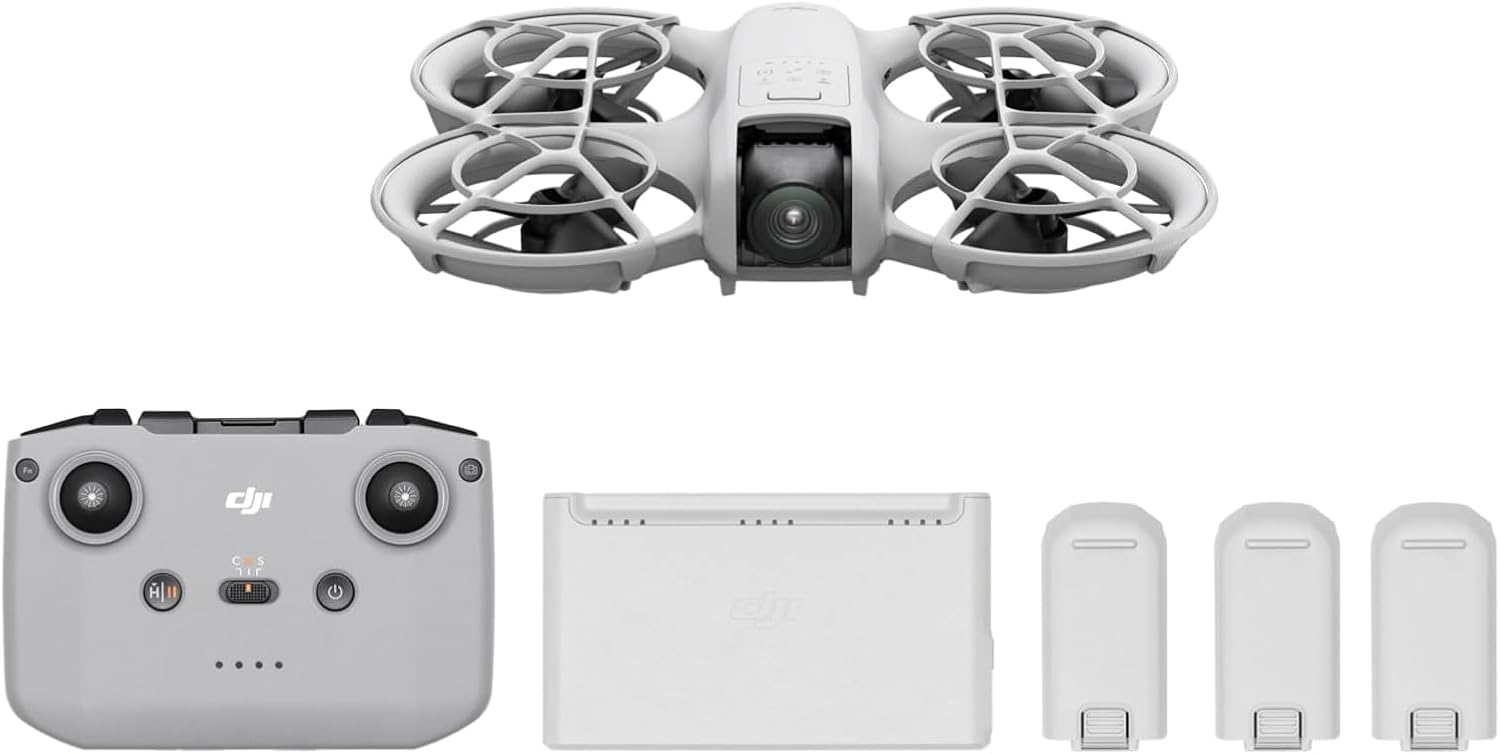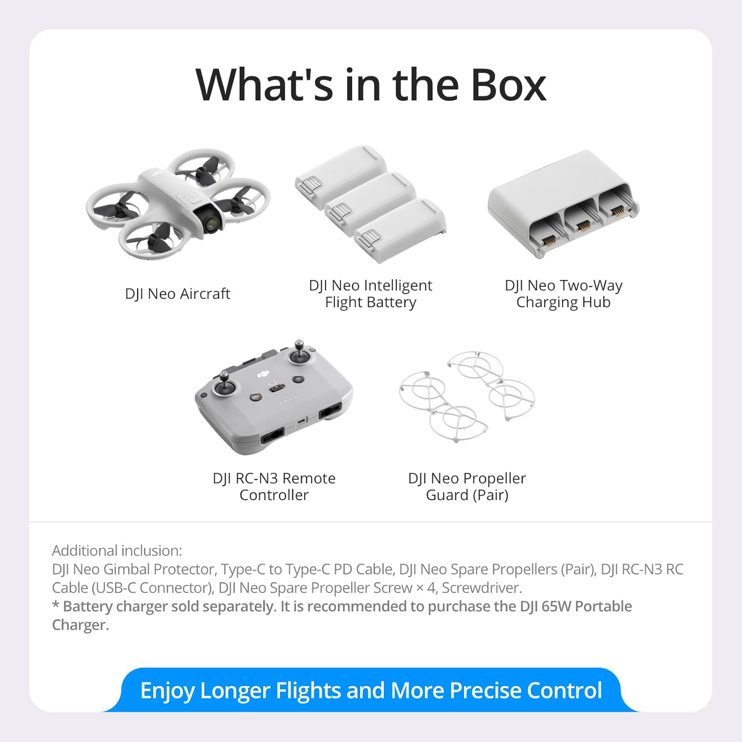 - If you're ready to level up and perform precise aerial acrobatics, then the DJI Neo Fly More Combo is perfect for you, complete with DJI Neo, RC-N3, 3 Batteries, a Two-Way Charging Hub, and more.