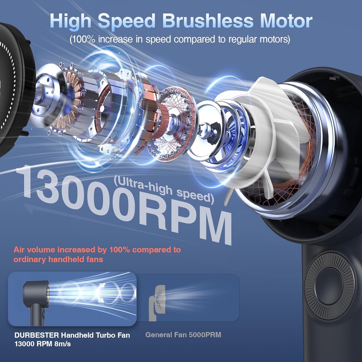 DURBESTER Portable Handheld Turbo Fan with 3600mAh USB Rechargeable Battery, 100-Speeds, 26H Max Cooling Time, Mini Fan Handheld Personal Fans Small Essentials for Women Beach Travel Vacation (Blue)
