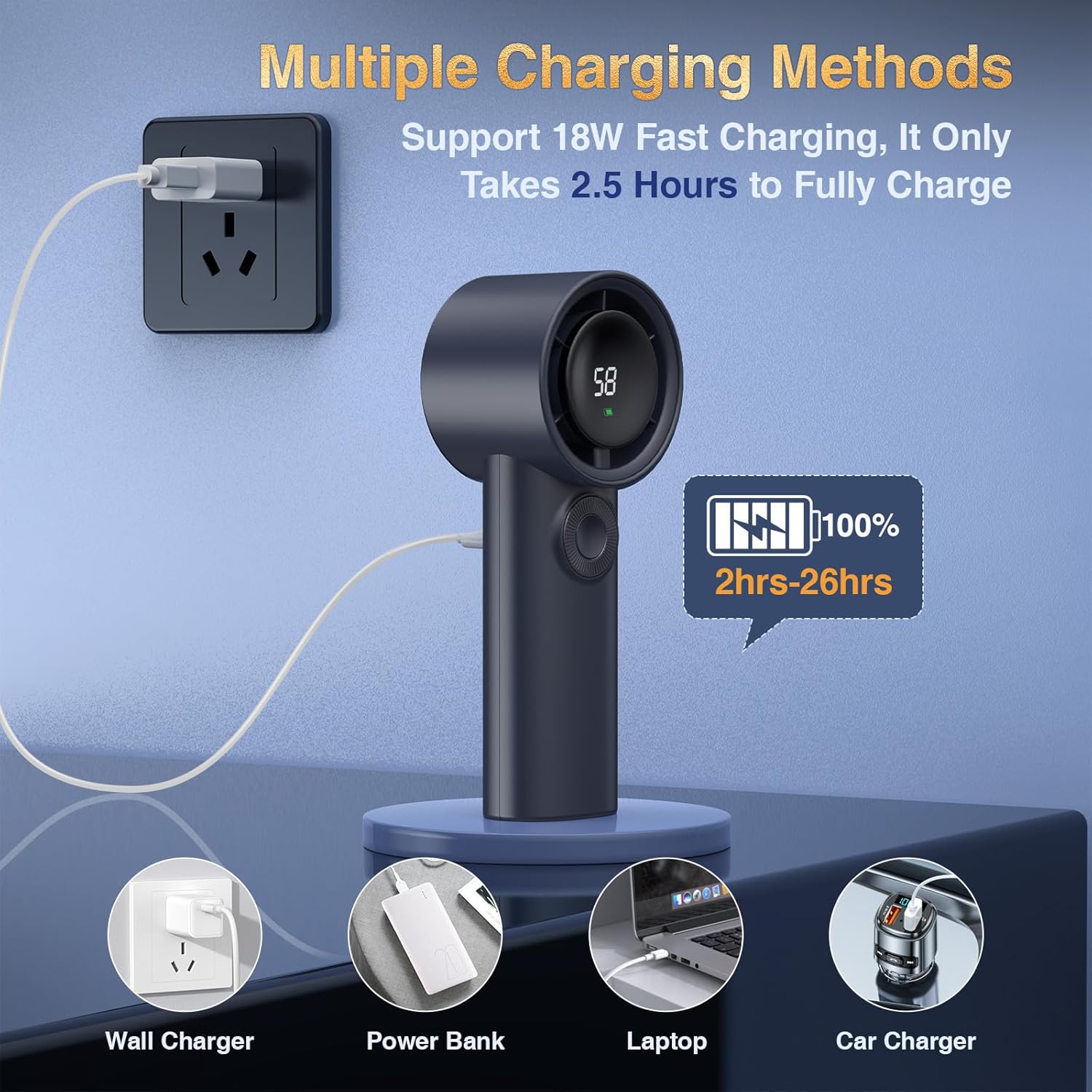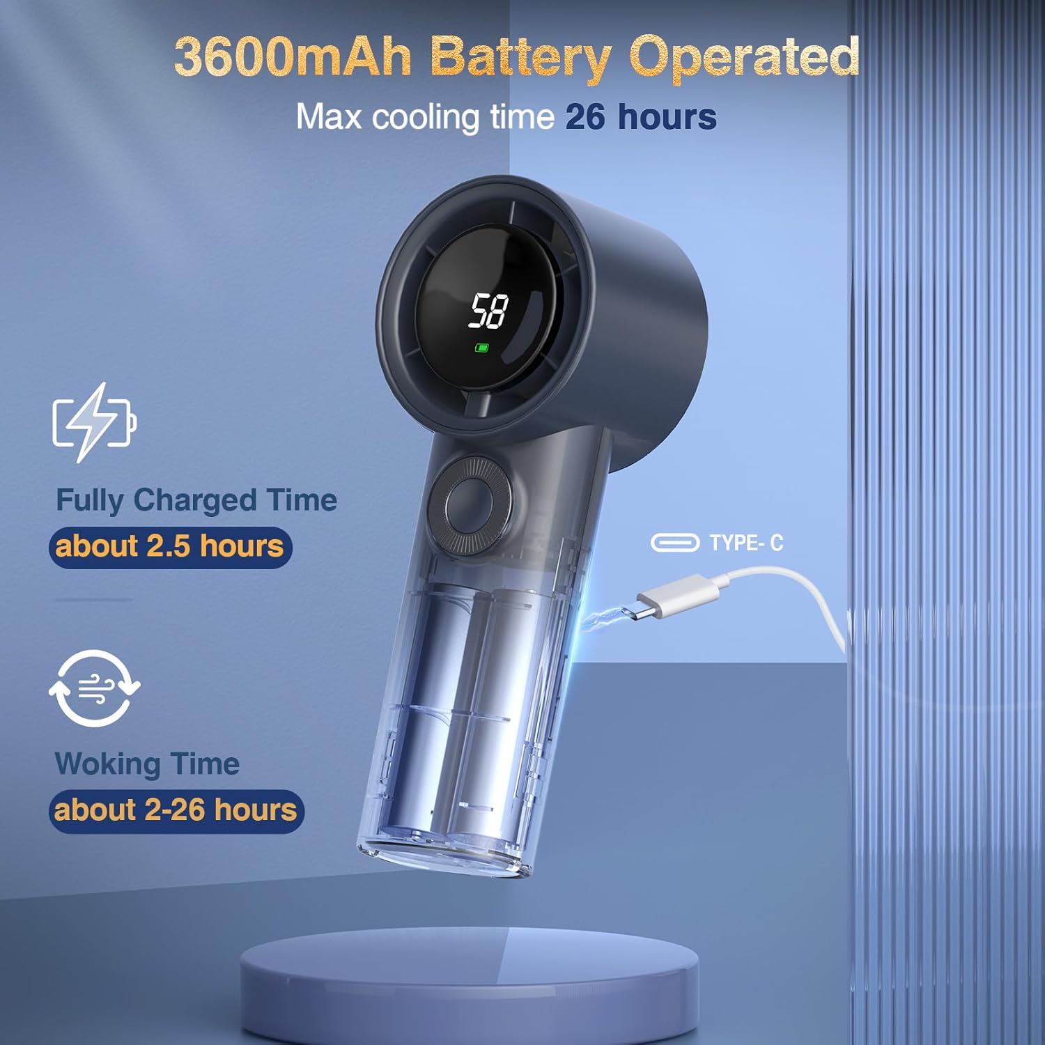 【26H Max Cooling Time - Fast Charging】With a built-in 3600mAh battery, this USB rechargeable handheld fan can run continuously for 2-26 hours((depending on different speeds), providing you with hours of refreshing breeze on the go. This powered hand fan can be fully recharged in just 3.5 hours by USB socket/laptop/power bank/car charger or any other device with USB port.