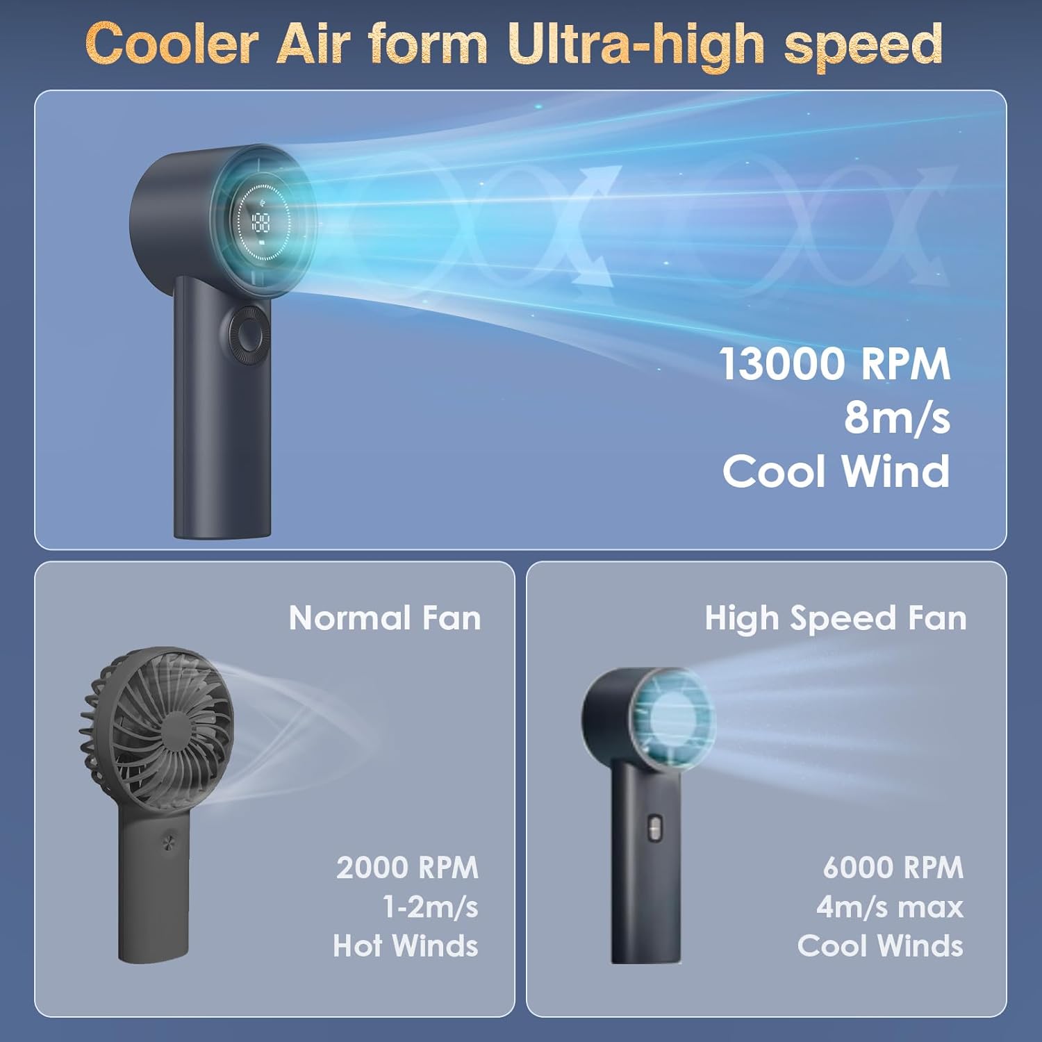 【High-Speed Powerful Handheld Fan】 This AF01 handheld turbo fan adopts an advanced 6-blade design and is equipped with a high-speed three-phase brushless motor, with a maximum wind speed of up to 8m/s. Maximum speed is 13,000 rpm, which is 2 times that of traditional handheld fans. This portable fan can more quickly cool you down in hot weather than ordinary fans.