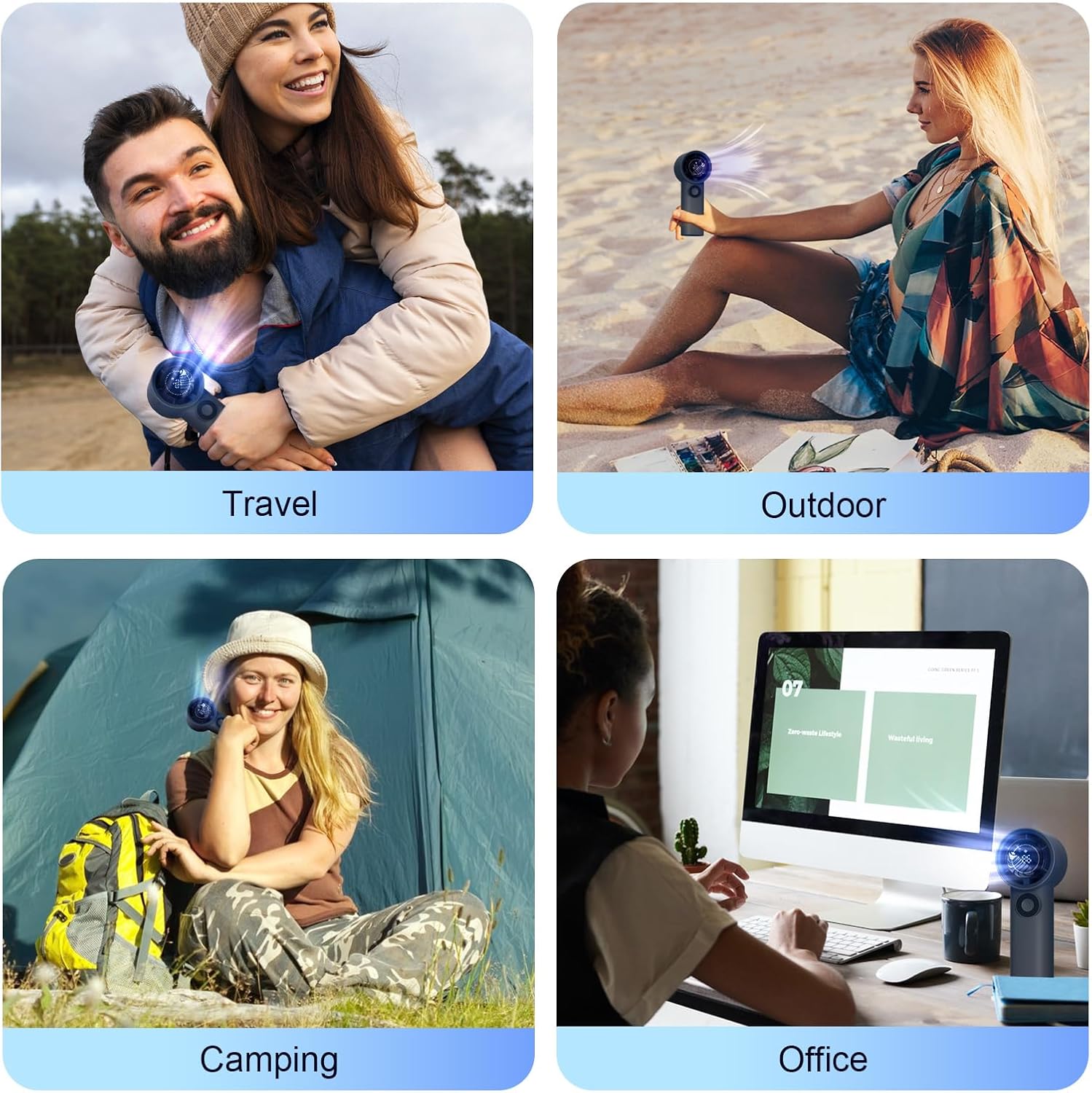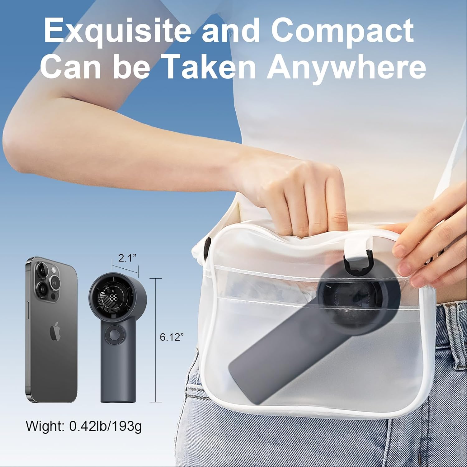 【Small Size - Best Gift】The size of this portable fan is 2.4"D x 6.12"W x 2.1"H 0.42lb, you can put it in your pocket or bag, so no matter where you go, this portable handheld fan can keep you cooling, it is the best cooling companion for traveling and outdoor sports, also a thoughtful gift for your family or friend. Besides it can be used as a small desk fan on a flat table when indoors,