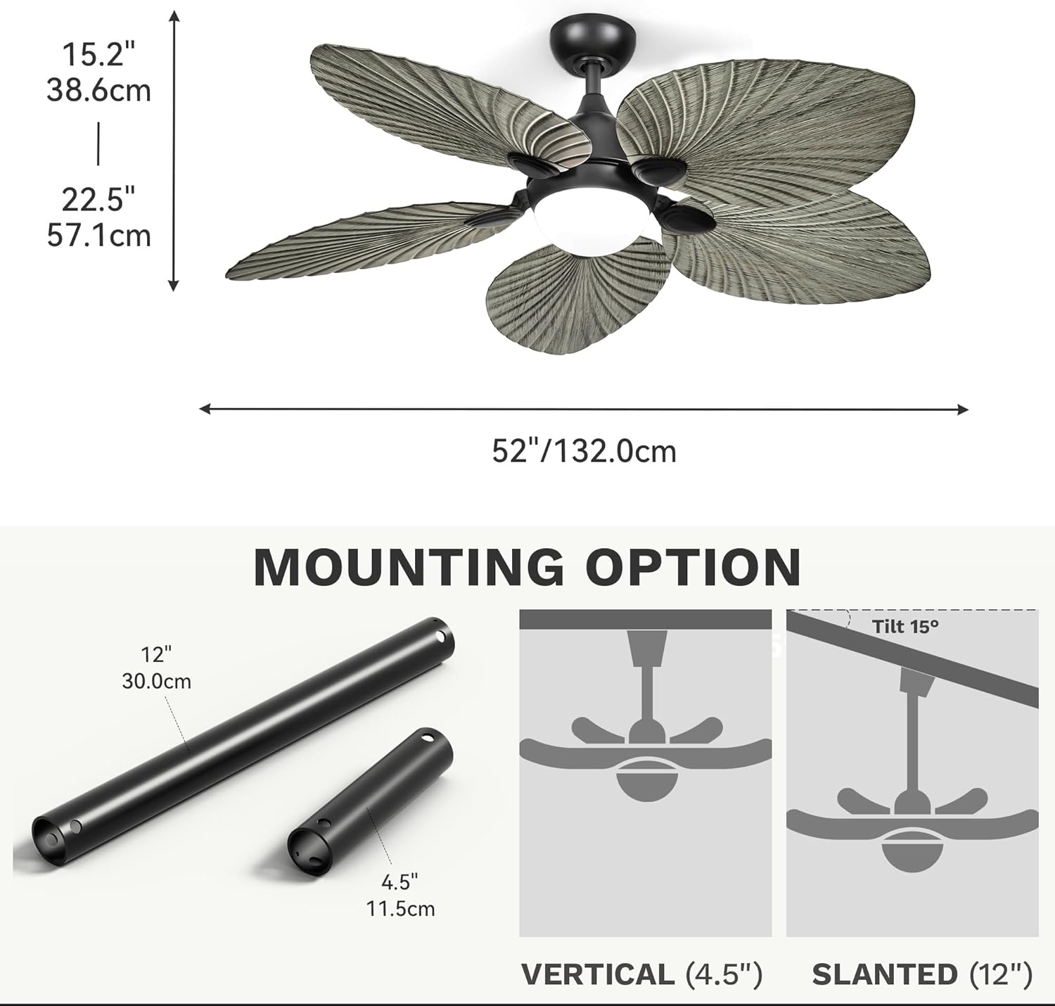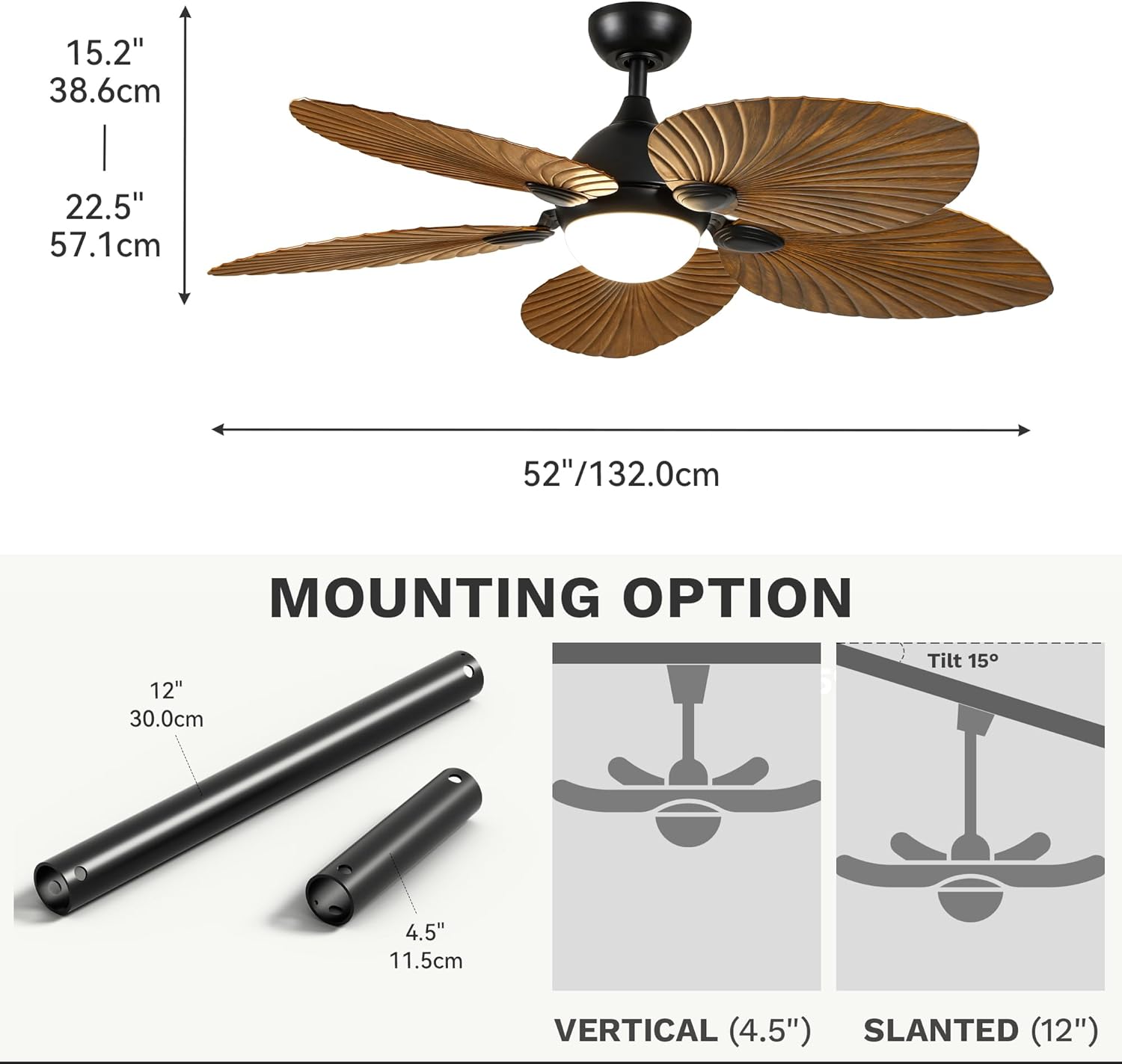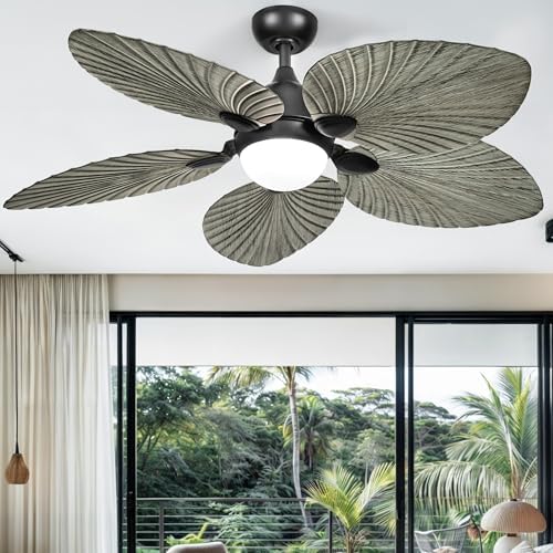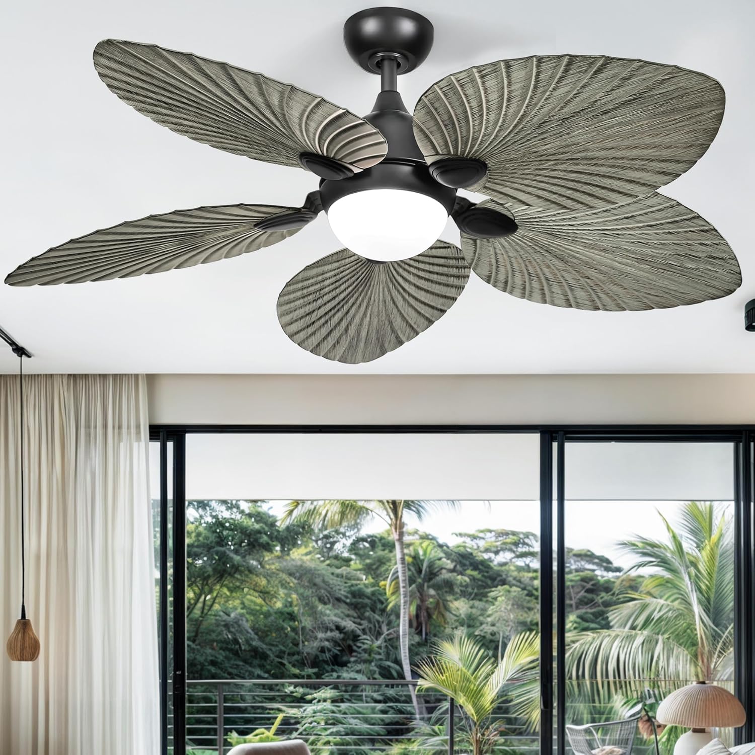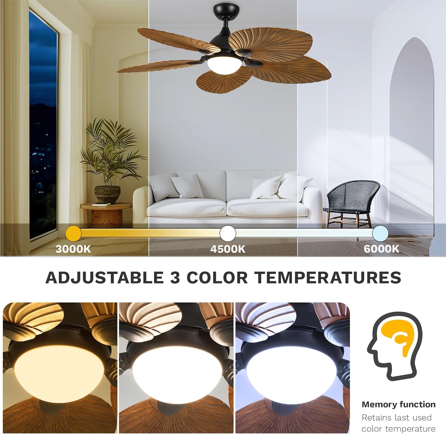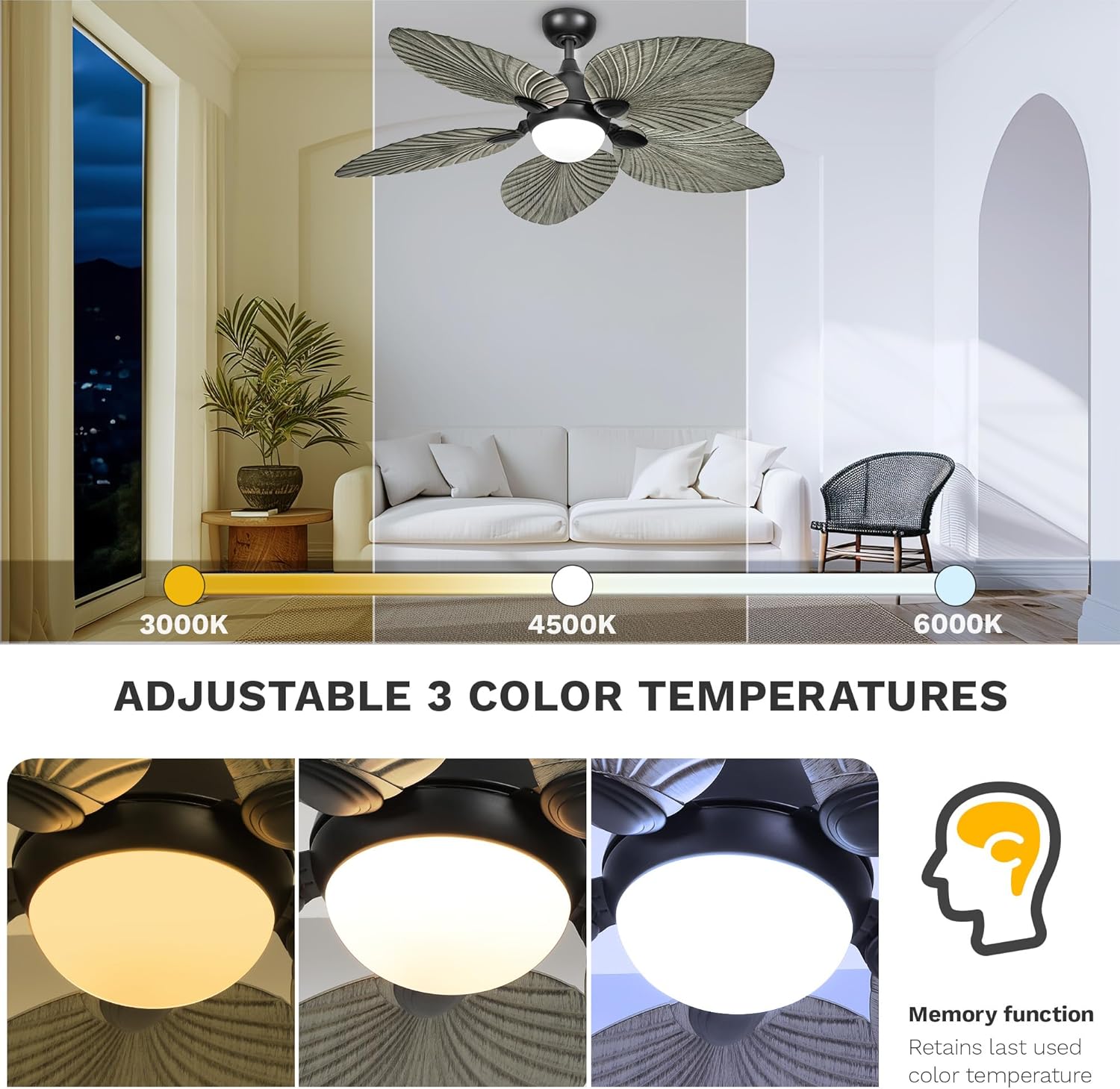 DWVO 52" Ceiling Fans with Lights, Tropical Ceiling Fan with Lights and remote, LED Tri-Color Temperature, Reversible 6 Speeds w/Quiet DC Motor for Living Room, Dining Room, Bedroom